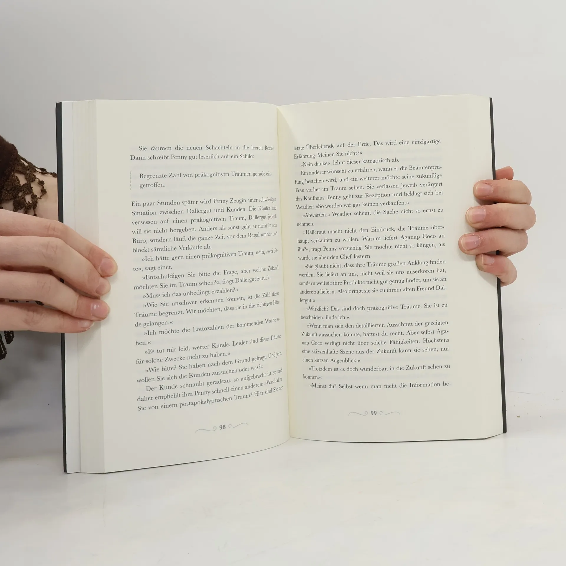 Penny lebt in einem besonderen Dorf, das nur im Schlaf betreten werden kann. Hier gibt es viel zu entdecken: Ein Food-Truck bietet schlaffördernde Snacks, während Maxim, der Albtraumproduzent, in einer dunklen Gasse arbeitet. Ein geheimnisvoller Mann wohnt in einer Hütte im Schneegebirge, und Elfen kreieren flugfähige Träume. Die Hauptattraktion ist das Kaufhaus von Dallergut, wo Penny engagiert arbeitet. In dem fünfstöckigen Holzgebäude wimmelt es von Kunden, sowohl Menschen als auch Tieren. Jede Etage bietet eine spezielle Traumart: teure und beliebte Träume, limitierte Ausgaben, alltägliche Erlebnisse wie Kurzreisen oder Feiern, sowie actionreiche Träume. Für den Mittagsschlaf gibt es spezielle Träume in der dritten Etage. Die Bezahlung erfolgt durch die Gefühle, die die Kunden nach dem Traum empfinden. Die Geschichten im Kaufhaus sind vielfältig und zeigen die persönlichen Erlebnisse der Kunden: Eine Frau sucht Träume mit dem Mann, in den sie heimlich verliebt ist, während ein Mann in einem Patientenhemd einen bestimmten Traum für seine Hinterbliebenen vorbestellen möchte. Die Träume helfen den Kunden, Verletzungen zu heilen, Sehnsüchte zu stillen und Ängste zu überwinden.