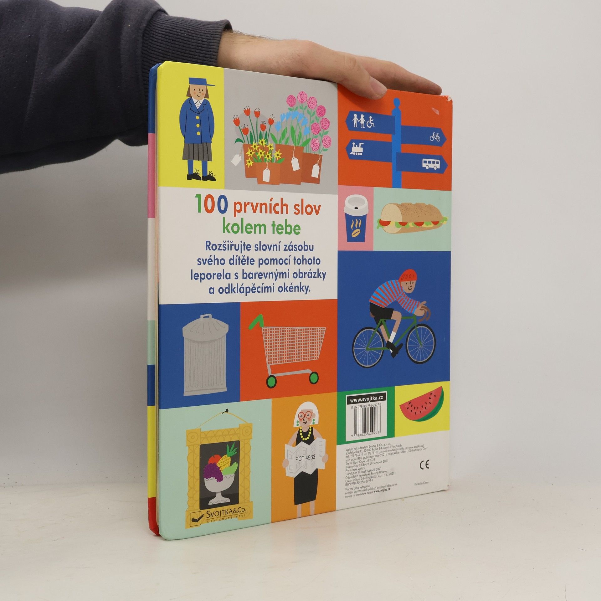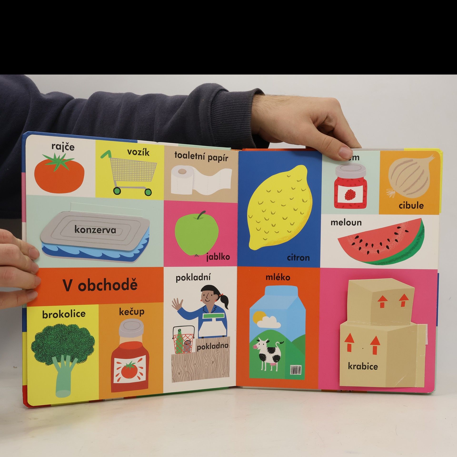 Rozšiřujte slovní zásobu svého dítěte pomocí tohoto leporela s barevnými obrázky a odklápěcími okénky.