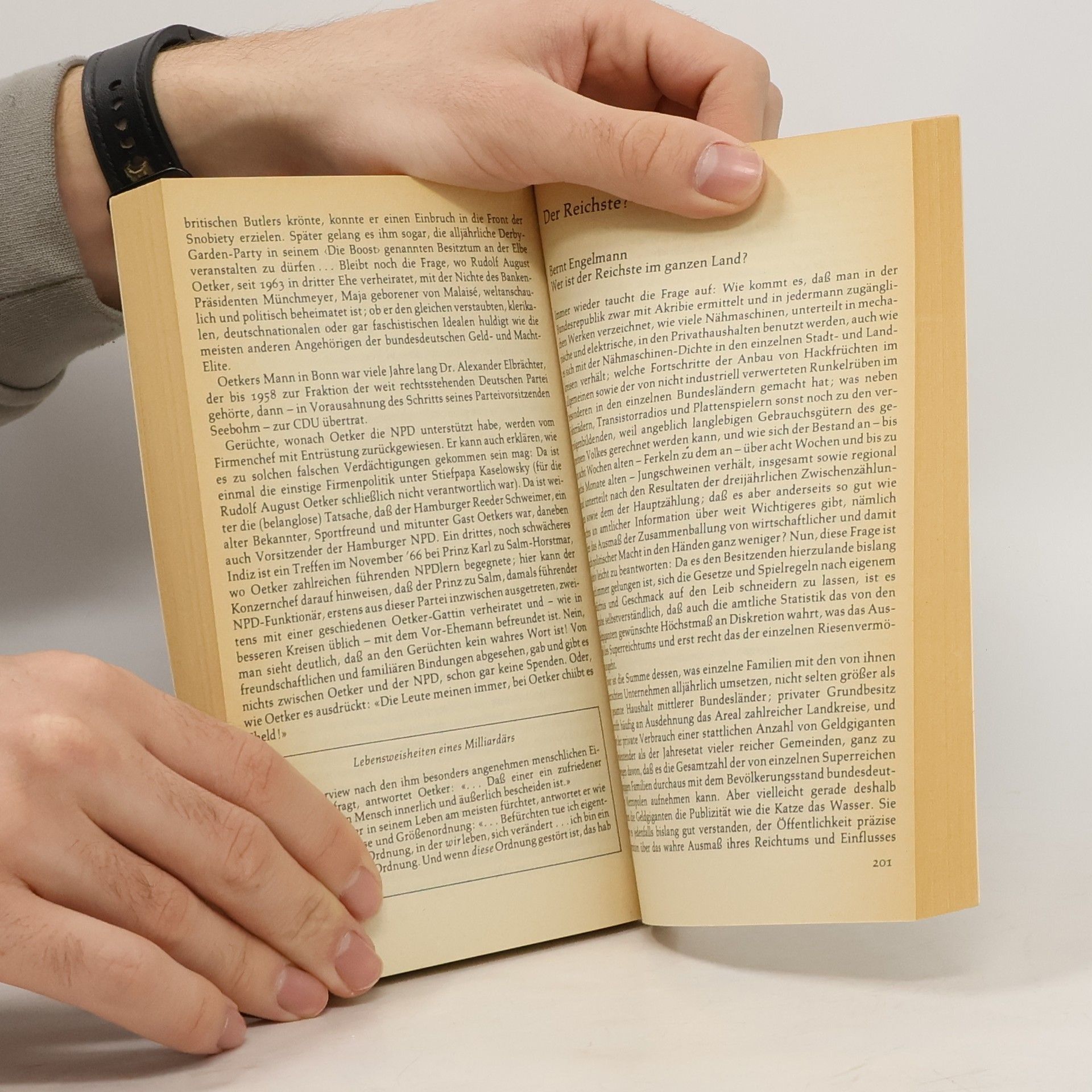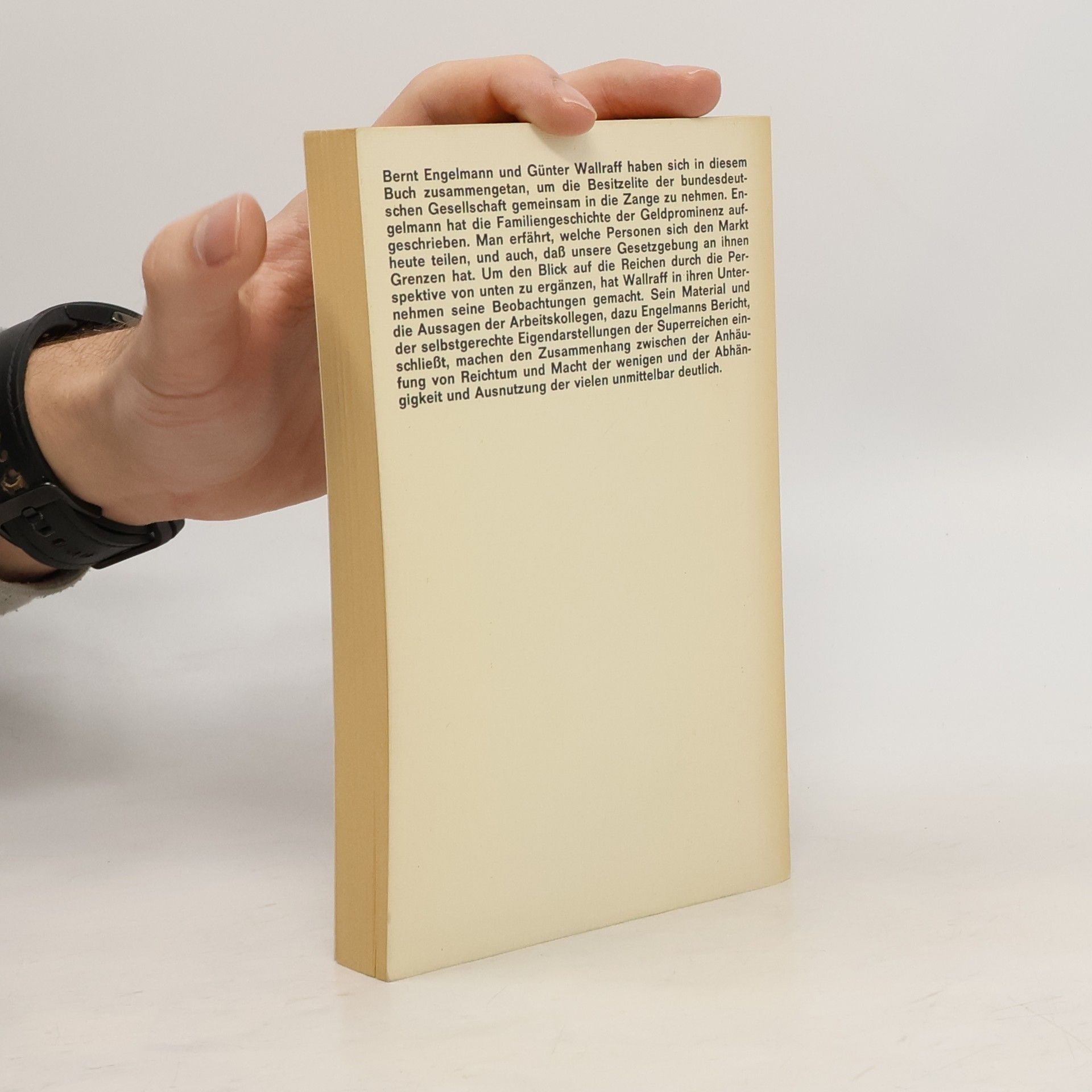 Bernt Engelmann und Günter Wallraff haben sich in diesem inzwischen berühmt gewordenen Buch zusammengetan, um die bundesdeutsche Gesellschaft vereint in die Zange zu nehmen. Aus verschiedenen Richtungen gehen sie ihr gemeinsames Ziel an: das Ausmaß des Widerspruchs zwischen der Anhäufung von Reichtum und Macht der wenigen und der Abhängigkeit und Ausnutzung der vielen aus unmittelbarer Anschauung durchsichtig zu machen. Die Welt der Milliardäre, für Millionen Leser in den Illustrierten verklärt, rückt hier nah und zeigt ihren weniger glänzenden Hintergrund. Engelmann war zu Besuch bei der Prominenz. Aus seinen Beobachtungen ergibt sich beiläufig die Geschichte des westdeutschen Nachkriegskapitals, die fast immer ein Beleg ist für die Wahrheit des Leitspruchs »Unrecht Gut gedeihe gut.«Wallraff war bei denen »da unten«, als Arbeiter, Vertreter, Bote, Portier oder Lakaien-Mönch. Er hat sich dabei den oft brutalen, oft verschrobenen Arbeitsbedingungen ausgesetzt. In seinen Berichten enthüllt sich die Pathologie der Reichen und vor allem die Realität, dass Geld, in Milliardenbeträgen in den Händen einzelner konzentriert, umschlägt in eine weit verzweigte politische Macht, der in unserer Gesellschaft kein Gesetz beizukommen vermag.