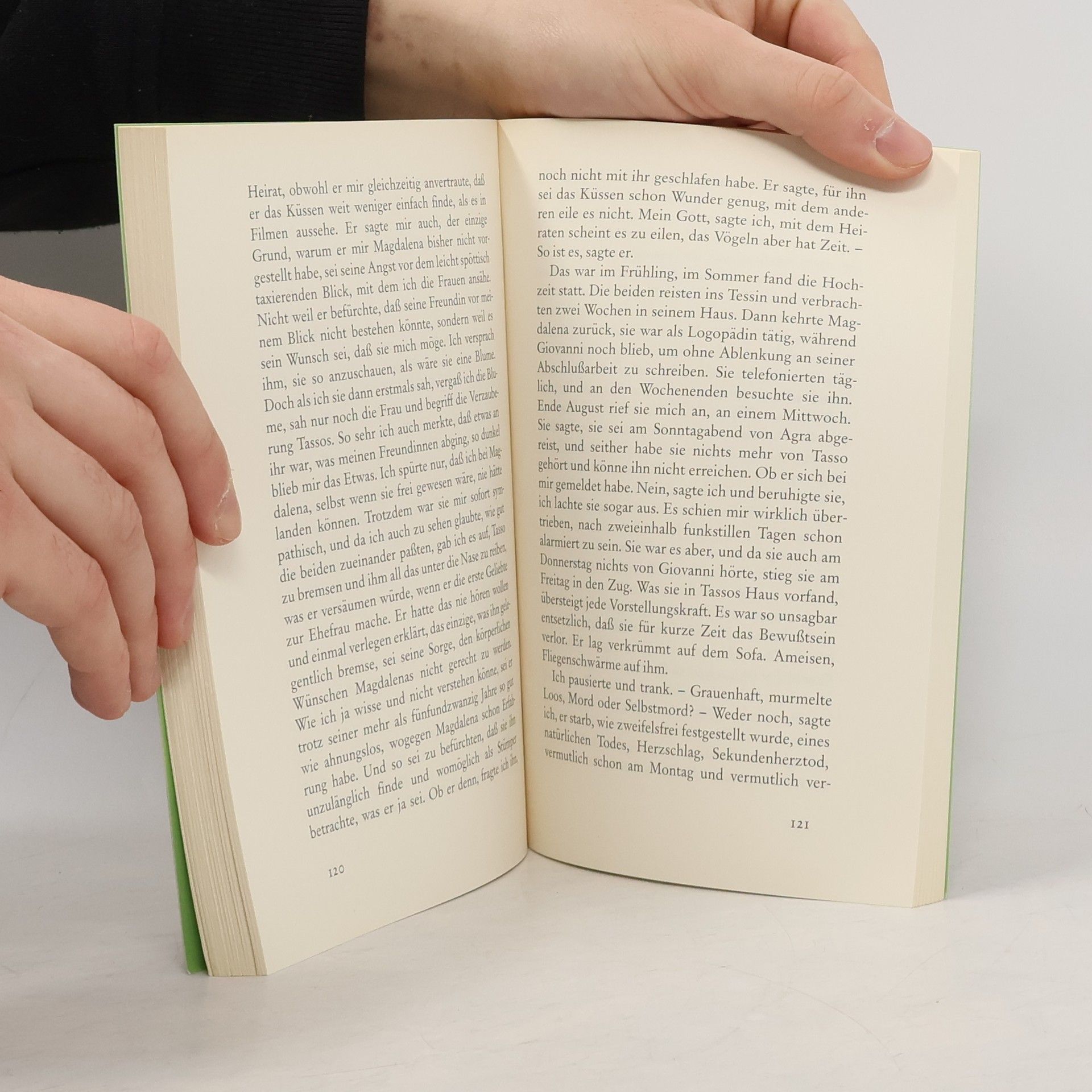 Der junge Scheidungsanwalt Clarin freut sich auf ein ungestörtes Pfingstwochenende in seinem Tessiner Ferienhaus, wo er einen Aufsatz für eine Fachzeitschrift schreiben möchte. Am ersten Abend lernt er auf der Terrasse des Hotels Bellavista einen älteren Mann kennen, einen scheinbar Verwirrten, einen Verrückten vielleicht. Sie reden und debattieren bis tief in die Nacht, und allmählich erzählen sie sich auch ihre Geschichten und Liebesgeschichten. Was als stockendes Gespräch zwischen Zufallsbekannten begonnen hat, entwickelt eine fiebrige, beklemmende Dynamik, der sich weder Clarin noch der Leser entziehen kann. Es sind zweifelhafte Umstände, unter denen Loos seine geliebte, fast vergötterte Frau verloren hat, und dieser Verlust scheint ihm die Welt schwer und verhasst zu machen. Clarin hingegen lebt leicht und gern. – Ferner könnten zwei Menschen einander nicht sein. Wie nah sie sich sind, stellt sich erst spät heraus.