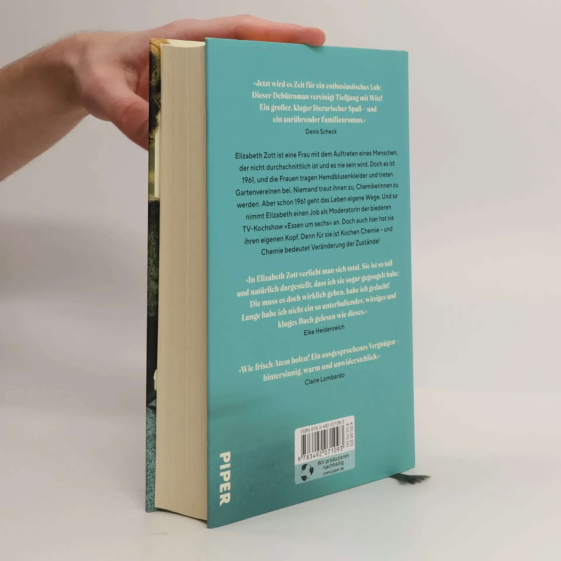 Etzt wird es Zeit für ein enthusiastisches Lob: Dieser Debütroman vereinigt Tiefgang mit Witz! Ein großer, kluger literarischer Spaß - und ein anrührender Familienroman.« Denis ScheckElizabeth Zott ist eine Frau mit dem Auftreten eines Menschen, der nicht durchschnittlich ist und es nie sein wird. Doch es ist 1961, und die Frauen tragen Hemdblusenkleider und treten Gartenvereinen bei. Niemand traut ihnen zu, Chemikerinnen zu werden. Aber schon 1961 geht das Leben eigene Wege. Und so nimmt Elizabeth einen Job als Moderatorin der biederen TV-Kochshow »Essen um sechs« an. Doch auch hier hat sie ihren eigenen Kopf. Denn für sie ist Kochen Chemie - und Chemie bedeutet Veränderung der Zustände!»In Elizabeth Zott verliebt man sich total. Sie ist so toll und natürlich dargestellt, dass ich sie sogar gegoogelt habe: Die muss es doch wirklich geben, habe ich gedacht! Lange habe ich nicht ein so unterhaltendes, witziges und kluges Buch gelesen wie dieses.« Elke Heidenreich»Wie frisch Atem holen! Ein ausgesprochenes Vergnügen - hintersinnig, warm und unwiderstehlich [Buchzentrum]