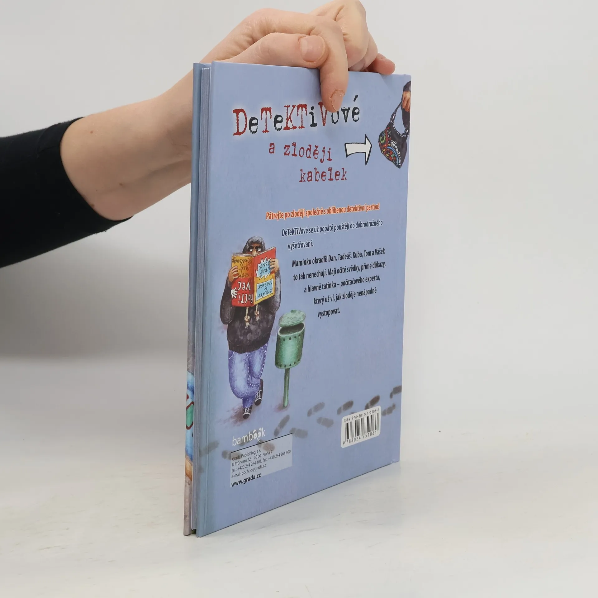 Pátrejte po zloději společně s oblíbenou detektivní partou! DeTeKTiVové se už popáté pouštějí do dobrodružného vyšetřování. Maminku okradli! Dan, Tadeáš, Kuba, Tom a Vašek to tak nenechají. Mají očité svědky, přímé důkazy, a hlavně tatínka - počítačového experta, který už ví, jak zloděje nenápadně vystopovat. Klučičí detektivní parta je v dobré formě. Svůj pátrací talent už kluci prokázali u vyšetřování čtyř zločinů. Teď se stanou dokonce přímými svědky krádeže, a tak se pátrací akce může rozjet na plné obrátky. Jako vždy jim sekunduje nadstrážmistr Mrázek. Pokud už vám detektivové chyběli, v jejich novém příběhu se můžete těšit na tajnou sledovačku, past na lupiče, obvyklé detektivní otázky a ilustrace, u kterých se dobře pobavíte.