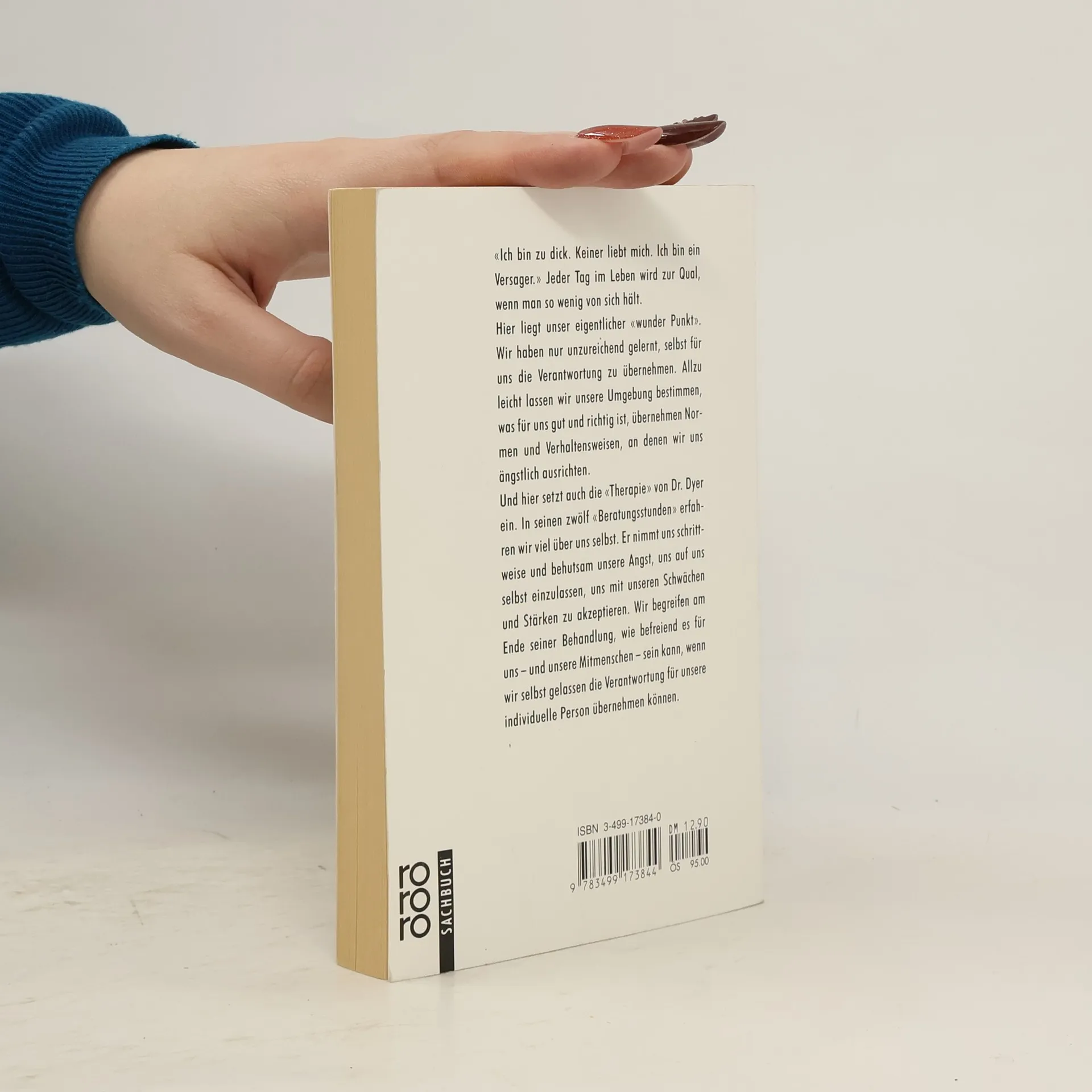 «Ich bin zu dick. Keiner liebt mich. Ich bin ein Versager.» Jeder Tag im Leben wird zur Qual, wenn man so wenig von sich hält. Hier liegt unser eigentlicher «wunder Punkt». Wir haben nur unzureichend gelernt, selbst für uns die Verantwortung zu übernehmen. Allzu leicht lassen wir unsere Umgebung bestimmen, was für uns gut und richtig ist, übernehmen Normen und Verhaltensweisen, an denen wir uns ängstlich ausrichten. Und hier setzt auch die «Therapie» von Dr. Dyer ein. In seinen zwölf «Beratungsstunden» erfahren wir viel über uns selbst. Er nimmt uns schrittweise und behutsam unsere Angst, uns auf uns selbst einzulassen, uns mit unseren Schwächen und Stärken zu akzeptieren. Wir begreifen am Ende seiner Behandlung, wie befreiend es für uns - und unsere Mitmenschen - sein kann, wenn wir selbst gelassen die Verantwortung für unsere individuelle Person übernehmen können.