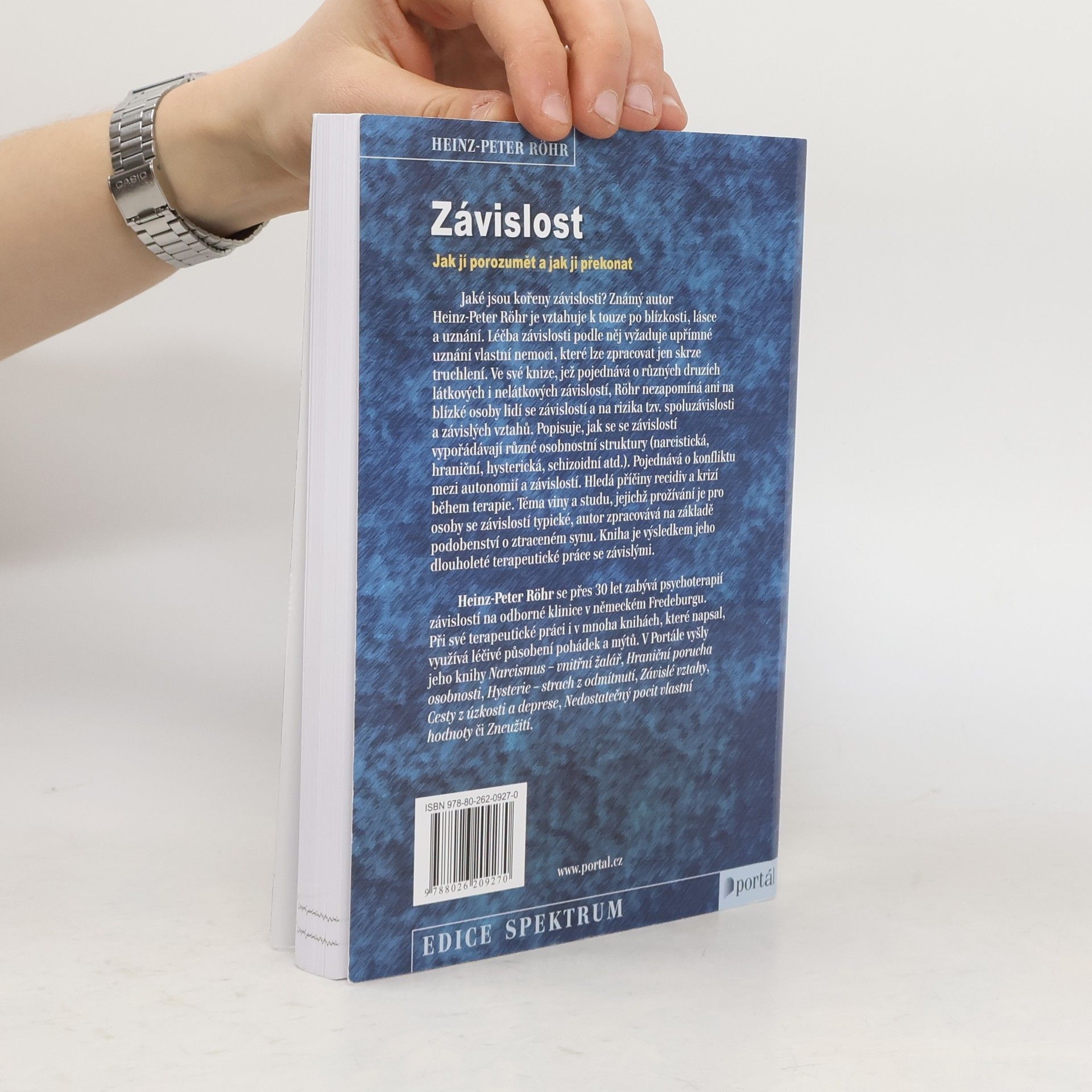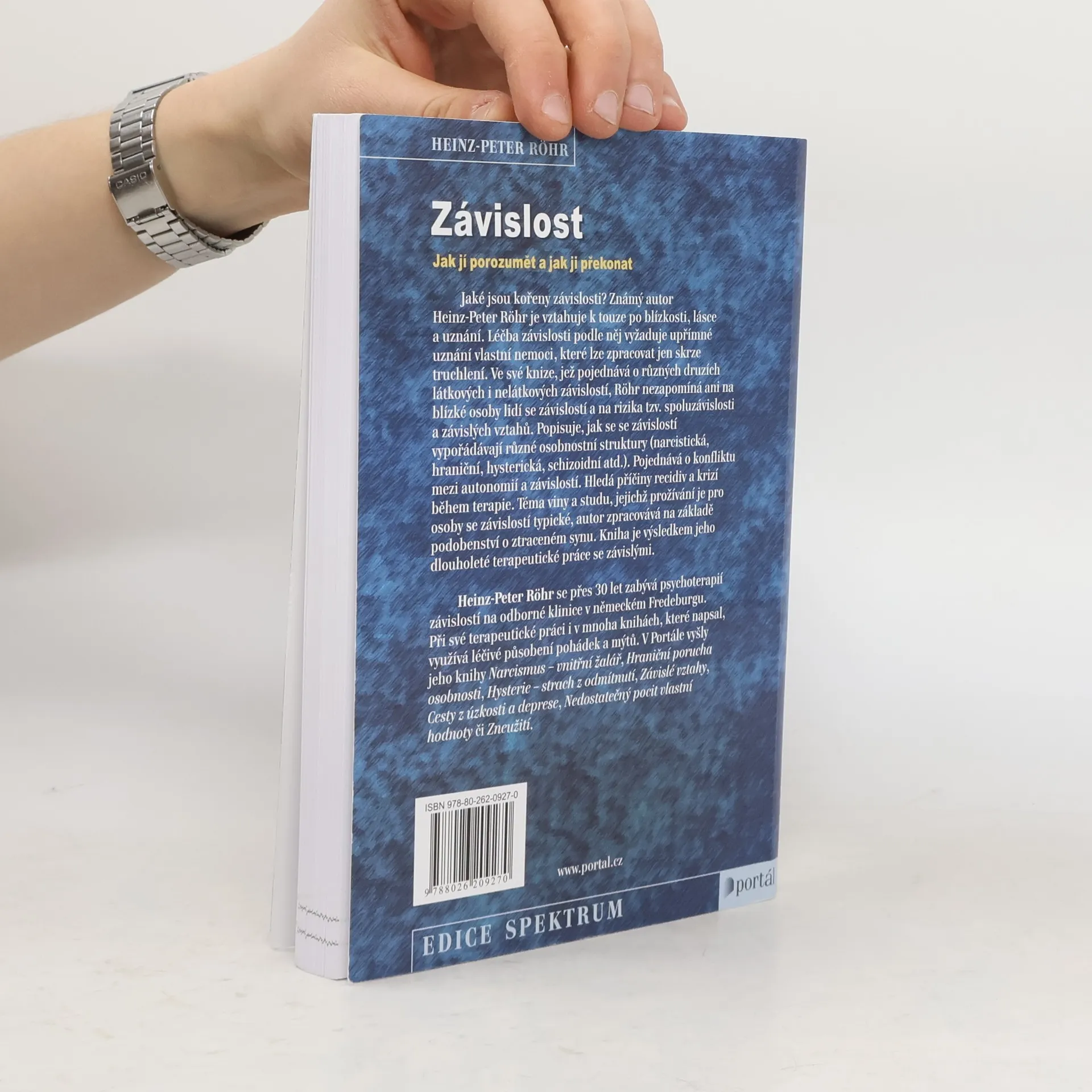 Podtitul: Jak jí porozumět a jak ji překonat. Jaké jsou kořeny závislosti? Známý autor Heinz-Peter Röhr je vztahuje k touze po blízkosti, lásce, uznání. Léčba závislosti podle něj vyžaduje upřímné uznání vlastní nemoci, které lze zpracovat jen skrze truchlení. Ve své knize, jež pojednává o různých druzích látkových i nelátkových závislostí, Röhr nezapomíná ani na blízké osoby lidí se závislostí a na rizika tzv. spoluzávislosti a závislých vztahů. Popisuje, jak se se závislostí vypořádávají různé osobnostní struktury (narcistická, hraniční, hysterická, schizoidní atd.). Pojednává o konfliktu mezi autonomií a závislostí. Hledá příčiny recidiv a krizí během terapie. Téma viny a studu, jejichž prožívání je pro osoby se závislostí typické, autor zpracovává na základě podobenství o ztraceném synu. Kniha je výsledkem jeho dlouholeté terapeutické práce se závislými. Heinz-Peter Röhr se přes 30 let zabývá psychoterapií závislostí na odborné klinice v německém Fredeburgu. Při své terapeutické práci i v mnoha knihách, které napsal, využívá léčivé působení pohádek a mýtů. V Portále vyšly jeho knihy Narcismus – vnitřní žalář, Hraniční porucha osobnosti, Hysterie – strach z odmítnutí, Závislé vztahy, Cesty z úzkosti a deprese, Nedostatečný pocit vlastní hodnoty, Zneužití.