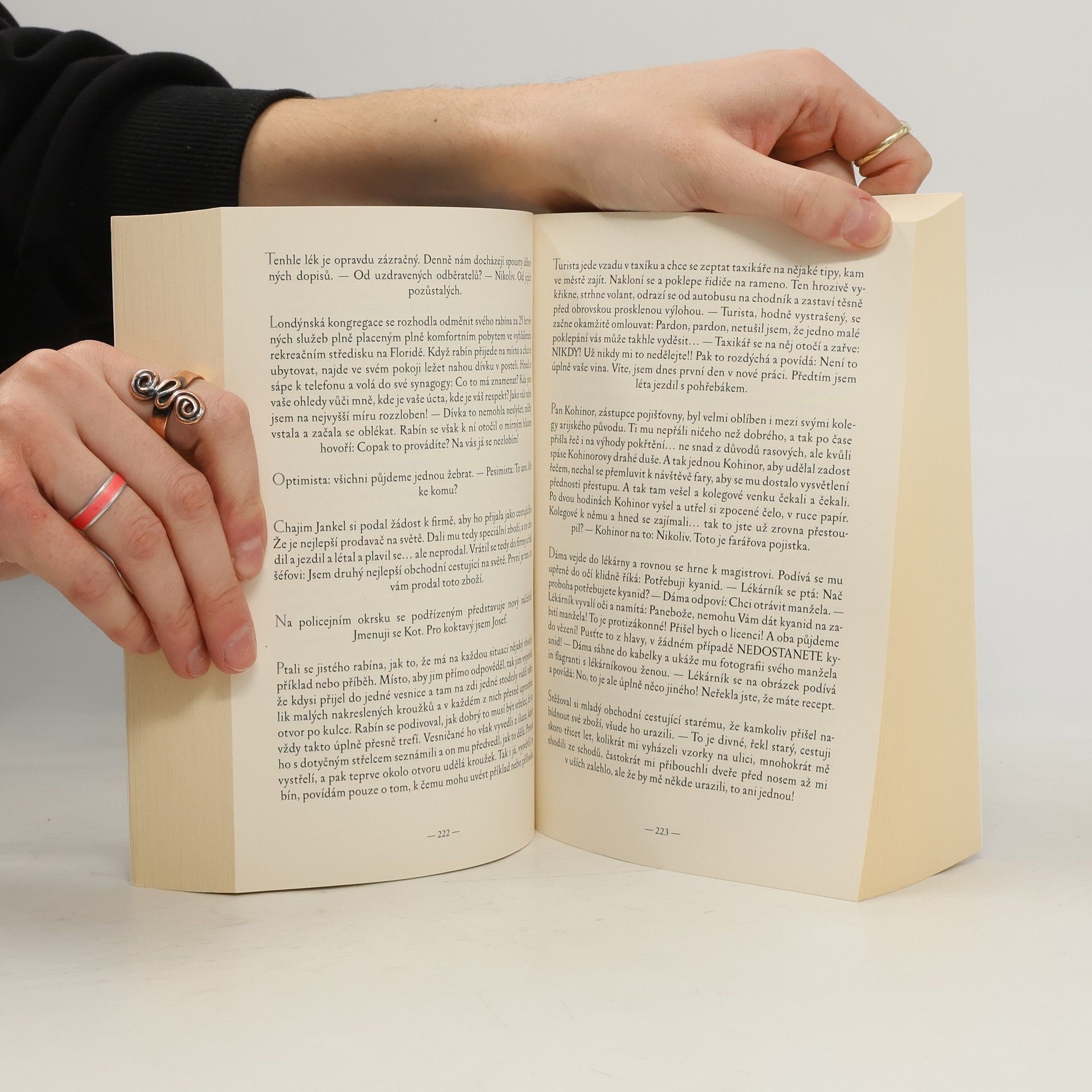 Doktor Štein měl kdysi neodbytného pacienta Schneidera, který byl na kordy s plotýnkou. Doktor Štein je naučil spolu vycházet, ale pak si sám přerazil páteř a týdny ležel nehybně. Vděčný pacient, a ten je někdy horší než boží dopuštění, začal posílat doktoru Šteinovi každé pondělní ráno příděl vtipů, aby mu bránice trochu namasírovala pajšl. Nejprve poslal Schneider jeden vtip, ten o Goliášovi, pak víc a víc, až se to ustálilo na sedmi, jak jinak. I počet adresátů vzrostl na pětistovku. Někteří z nich se prý dokonce začali těšit v pondělí do práce. některé vtipy byly zaručené, jiné nové a neznámé, do češtiny přeložené poprvé. Schneider je posílal dlouhých a tučných sedm let, pondělí co pondělí bez přerušení, celých 365 pondělků v řadě.