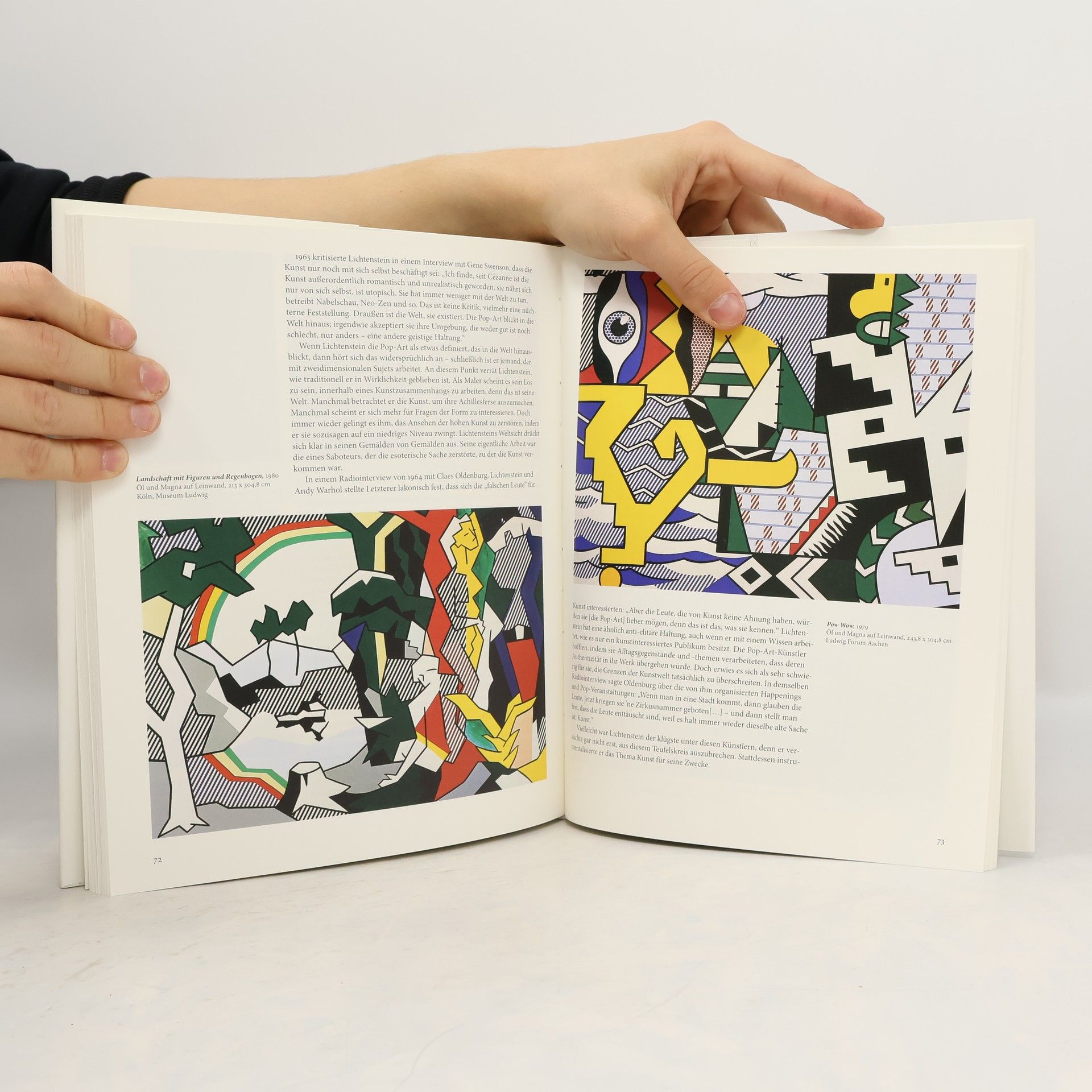 Der amerikanische Maler Roy Lichtenstein (1923–1997) fand Ende der 1950er Jahre, fast resigniert in der von abstraktem Expressionismus dominierten Kunstszene, durch einen Zufall zu seiner eigenen Bildsprache. Ein buntes Kaugummibild seiner Kinder inspirierte seine berühmten Sprechblasenbilder, die anfangs schockierten, ihn jedoch bald neben Warhol und Rauschenberg zum Star der Pop-Art machten. Lichtenstein verwendete triviale Alltagsbilder aus Comicstrips und Werbung, ähnlich wie seine Zeitgenossen Andy Warhol und James Rosenquist, die ebenfalls mit den Bildwelten der amerikanischen Massenmedien spielten. Werke wie Look, Mickey! (1961), Drowning Girl (1963) und Whaam! (1963) imitierten die moderne Drucktechnik mit Rasterpunkten, den Benday-Dots, und verwandelten alltägliche Motive in monumentale Kunstwerke. Dieser Stil ist untrennbar mit Lichtensteins Namen verbunden. Das Buch bietet einen Überblick über sein Schaffen, von seinen frühesten Pop-Art-Statements über seine Reaktionen auf den abstrakten Expressionismus bis hin zu seinen Neuinterpretationen moderner Meisterwerke, einschließlich seiner gerasterten Versionen von Picassos, Mondrians und Dalís.