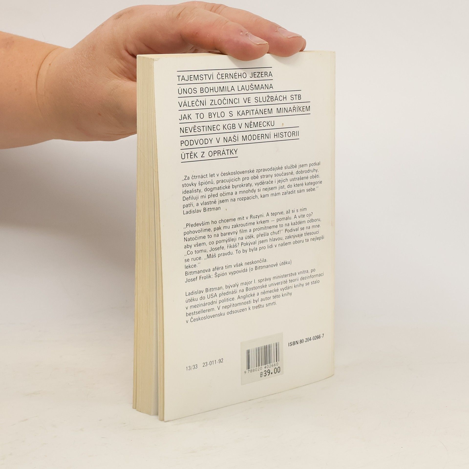 Podtitul: Pohledy do zákulisí československé zpravodajské služby Svědectví o fungování tajných a zpravodaj. služeb. Před čtenářem se v novém světle odvíjejí události, které znal v jiné podobě. V ČSFR vydání první (rozšířené oproti vydání nakl. 68 Publishers v roce 1981).