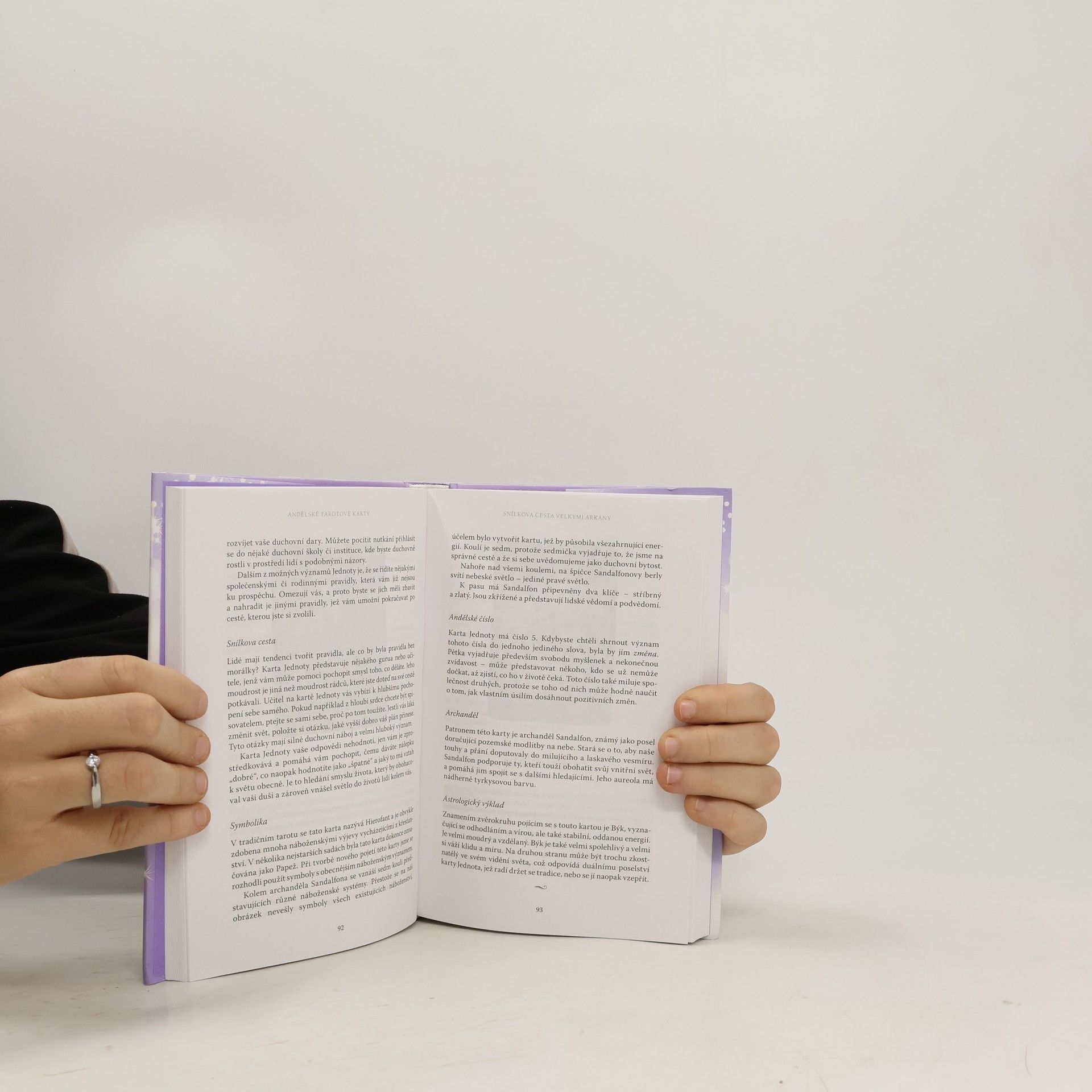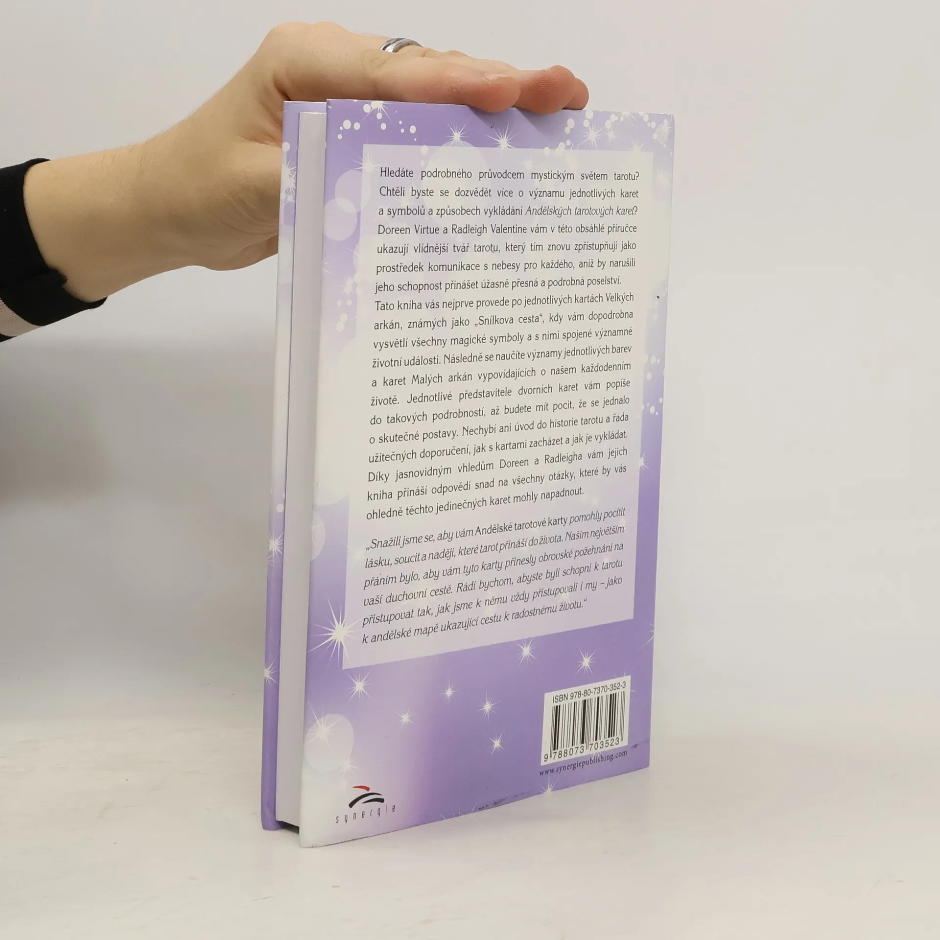 Hledáte podrobného průvodcem mystickým světem tarotu? Chtěli byste se dozvědět více o významu jednotlivých karet a symbolů a způsobech vykládání Andělských tarotových karet? Doreen Virtue a Radleigh Valentine vám v této obsáhlé příručce ukazují vlídnější tvář tarotu, který tím znovu zpřístupňují jako prostředek komunikace s nebesy pro každého, aniž by narušili jeho schopnost přinášet úžasně přesná a podrobná poselství. Tato úchvatná kniha vás nejprve provede po jednotlivých kartách Velkých arkán, známých jako „Snílkova cesta“, kdy vám dopodrobna vysvětlí všechny magické symboly a s nimi spojené významné životní události. V Malých arkánách vás pak naučí znát významy jednotlivých barev a karet vypovídajících o našem každodenním životě. Zároveň vám popíše jednotlivé představitele dvorních karet do takových podrobností, až budete mít pocit, že se jednalo o skutečné postavy. Doreen a Radleigh mají neuvěřitelnou schopnost vědět, co jejich čtenáře při vykládání karet zajímá. Díky tomu jejich kniha přináší odpovědi snad na všechny možné otázky. „Snažili jsme se, aby vám Andělské tarotové karty pomohly pocítit lásku, soucit a naději, které tarot přináší do života. Naším největším přáním bylo, aby vám tyto karty přinesly obrovské požehnání na vaší duchovní cestě. Rádi bychom, abyste byli schopni k tarotu přistupovat tak, jak jsme k němu vždy přistupovali i my – jako k andělské mapě ukazující cestu k radostnému životu.“