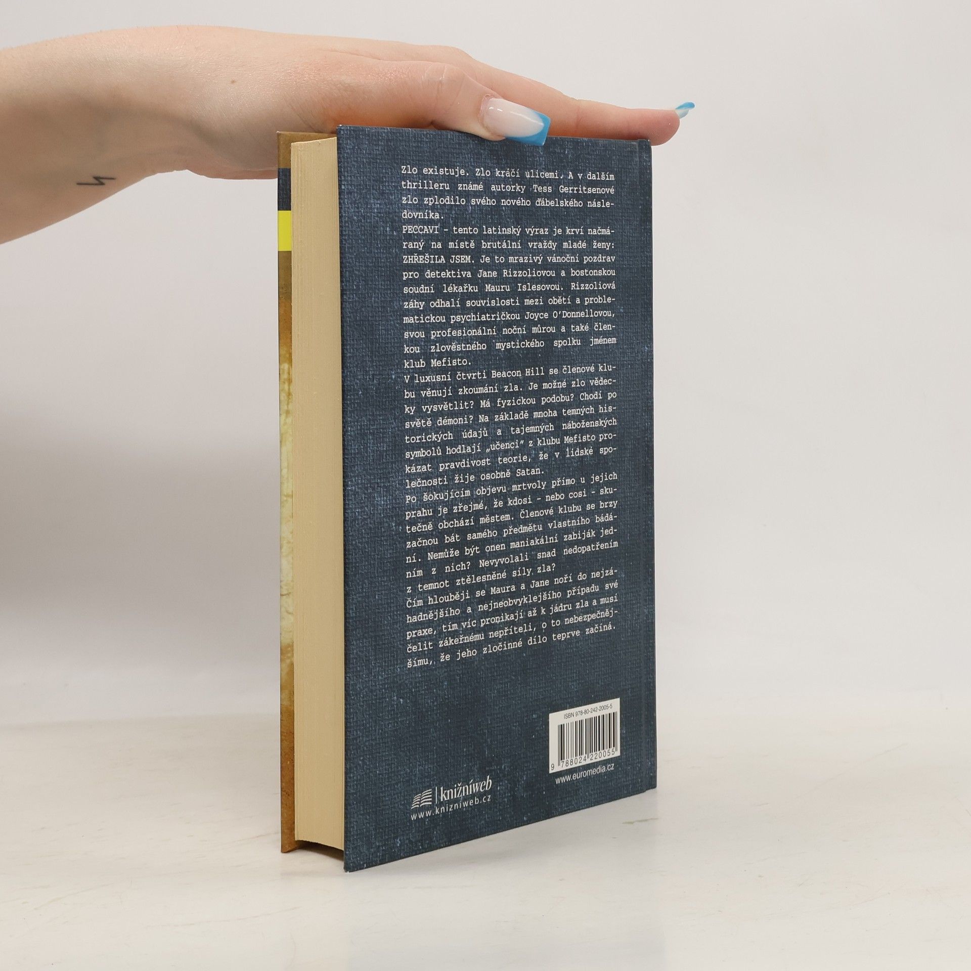 Zlo existuje. Zlo kráčí ulicemi. A v dalším thrilleru známé autorky Tess Gerritsenové zlo zplodilo svého nového ďábelského následovníka. PECCAVI - tento latinský výraz je krví načmáraný na místě brutální vraždy mladé ženy: ZHŘEŠILA JSEM. Je to mrazivý vánoční pozdrav pro detektiva Jane Rizzoliovou a bostonskou soudní lékařku Mauru Islesovou. Rizzoliová záhy odhalí souvislosti mezi obětí a problematickou psychiatričkou Joyce O Donnellovou, svou profesionální noční můrou a také členkou zlověstného mystického spolku jménem klub Mefisto. V luxusní čtvrti Beacon Hill se členové klubu věnují zkoumání zla. Je možné zlo vědecky vysvětlit? Má fyzickou podobu? Chodí po světě démoni? Na základě mnoha temných historických údajů a tajemných náboženských symbolů hodlají "učenci" z klubu Mefisto prokázat pravdivost teorie, že v lidské společnosti žije osobně Satan. Po šokujícím objevu mrtvoly přímo u jejich prahu je zřejmé, že kdosi - nebo cosi - skutečně obchází městem. Členové klubu se brzy začnou bát samého předmětu vlastního bádání. Nemůže být onen maniakální zabiják jedním z nich? Nevyvolali snad nedopatřením z temnot ztělesněné síly zla? Čím hlouběji se Maura a Jane noří do nejzáhadnějšího a nejneobvyklejšího případu své praxe, tím víc pronikají až k jádru zla a musí čelit zákeřnému nepříteli, o to nebezpečnějšímu, že jeho zločinné dílo teprve začíná.