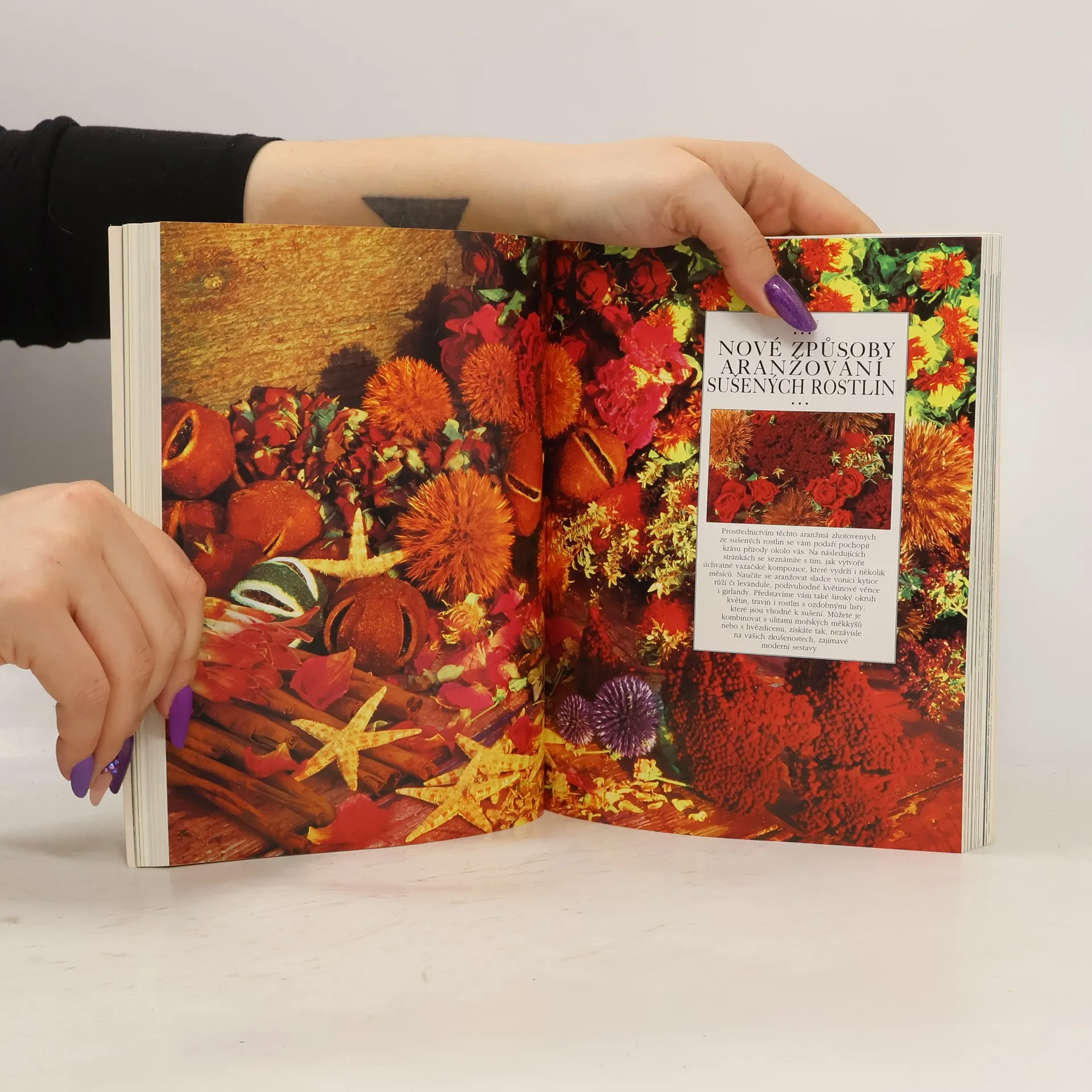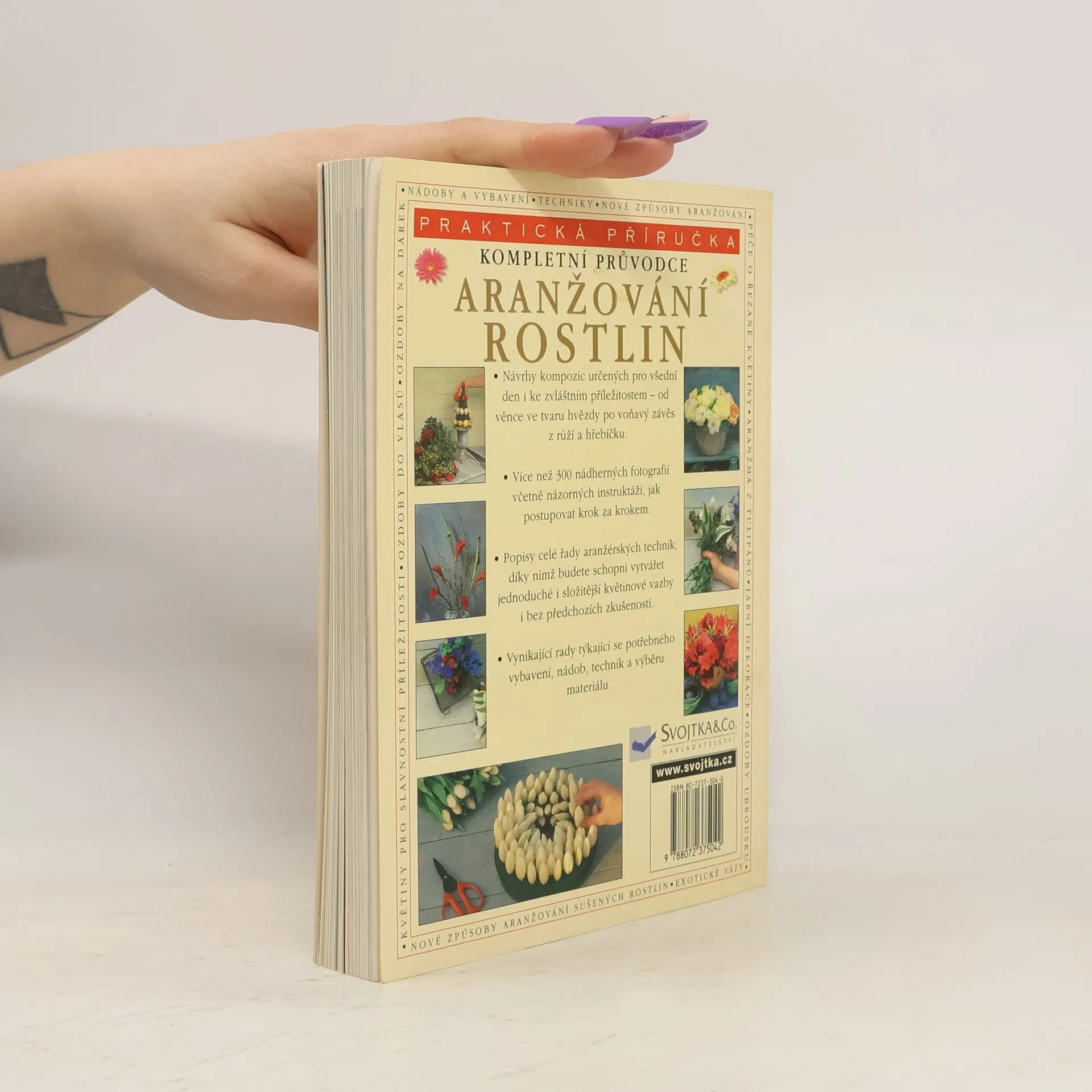 - Návrhy kompozic určených pro všední den i ke zvláštním příležitostem - od věnce ve tvaru hvězdy po voňavý závěs z růží a hřebíčku. - Více než 300 nádherných fotografií včetně názorných instruktáží, jak postupovat krok za krokem. - Popis celé řady aranžérských technik, díky nimž budete schopni vytvářet jednoduché i složitější květinové vazby i bez předchozích zkušeností. - Vynikající rady týkající se potřebného vybavení, nádob, technik a výběru materiálu.