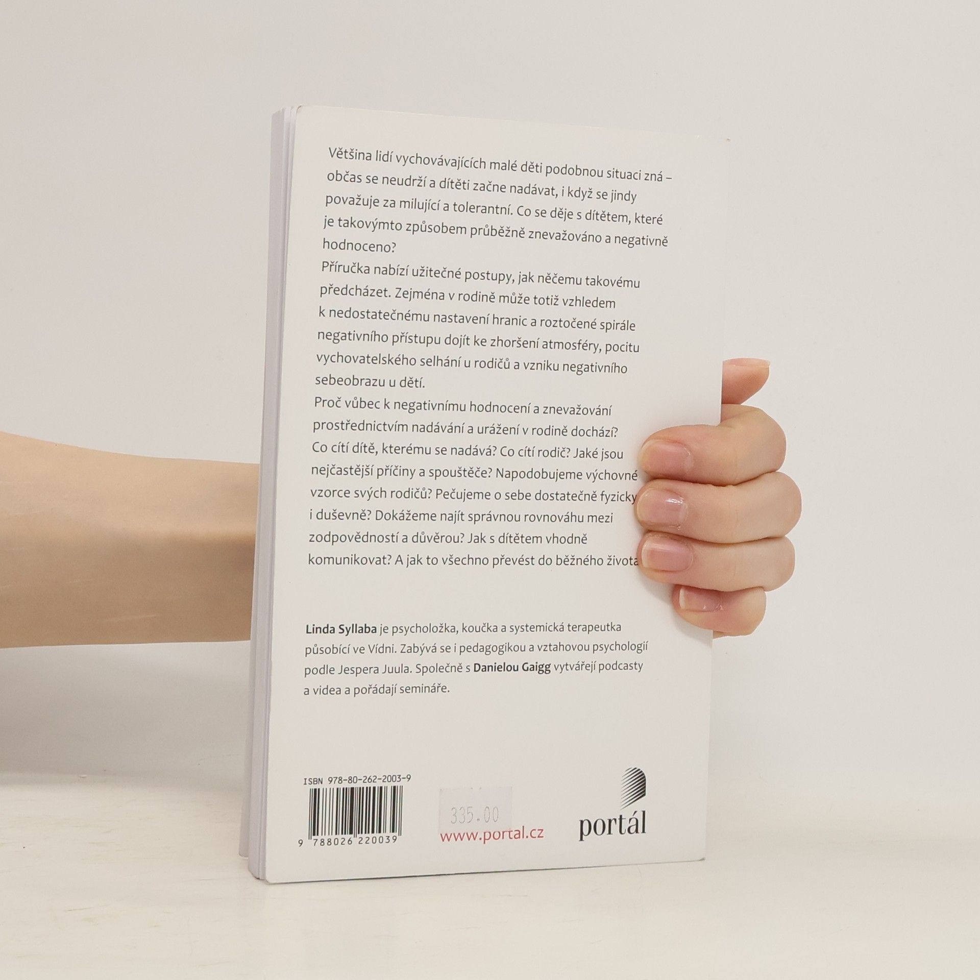 Většina lidí vychovávajících malé děti podobnou situaci zná – občas se neudrží a dítěti začne nadávat. Příručka popisuje, co se děje s dítětem, které je takovýmto způsobem průběžně znevažováno a negativně hodnoceno, a nabízí užitečné postupy, jak něčemu takovému předcházet. Zejména v rodině může totiž vzhledem k nedostatečnému nastavení hranic a roztočené spirále negativního přístupu dojít ke zhoršení atmosféry, pocitu vychovatelského selhání u rodičů a vzniku negativního sebeobrazu u dětí.Kniha rozebírá jednotlivé aspekty této situace: Proč vůbec k negativnímu hodnocení a znevažování prostřednictvím nadávání a urážení v rodině dochází? Co cítí dítě, kterému se nadává? Co cítí rodič?Které jsou nejčastější příčiny a spouštěče? Napodobujeme výchovné vzorce svých rodičů?Pečujeme o sebe dostatečně fyzicky i duševně? Dokážeme najít správnou rovnováhu mezi zodpovědností a důvěrou? Jak s dítětem vhodně komunikovat? A jak to všechno převést do praxe?Každá část je doplněna kapitolkou s vyjádřením odborníka, otázkami a cvičeními.Linda Syllaba je psycholožka, koučka a systemická terapeutka působící ve Vídni. Zabývá se i pedagogikou a vztahovou psychologií podle Jespera Juula. Společně s Danielou Gaigg vytvářejí podcasty a videa a pořádají semináře.