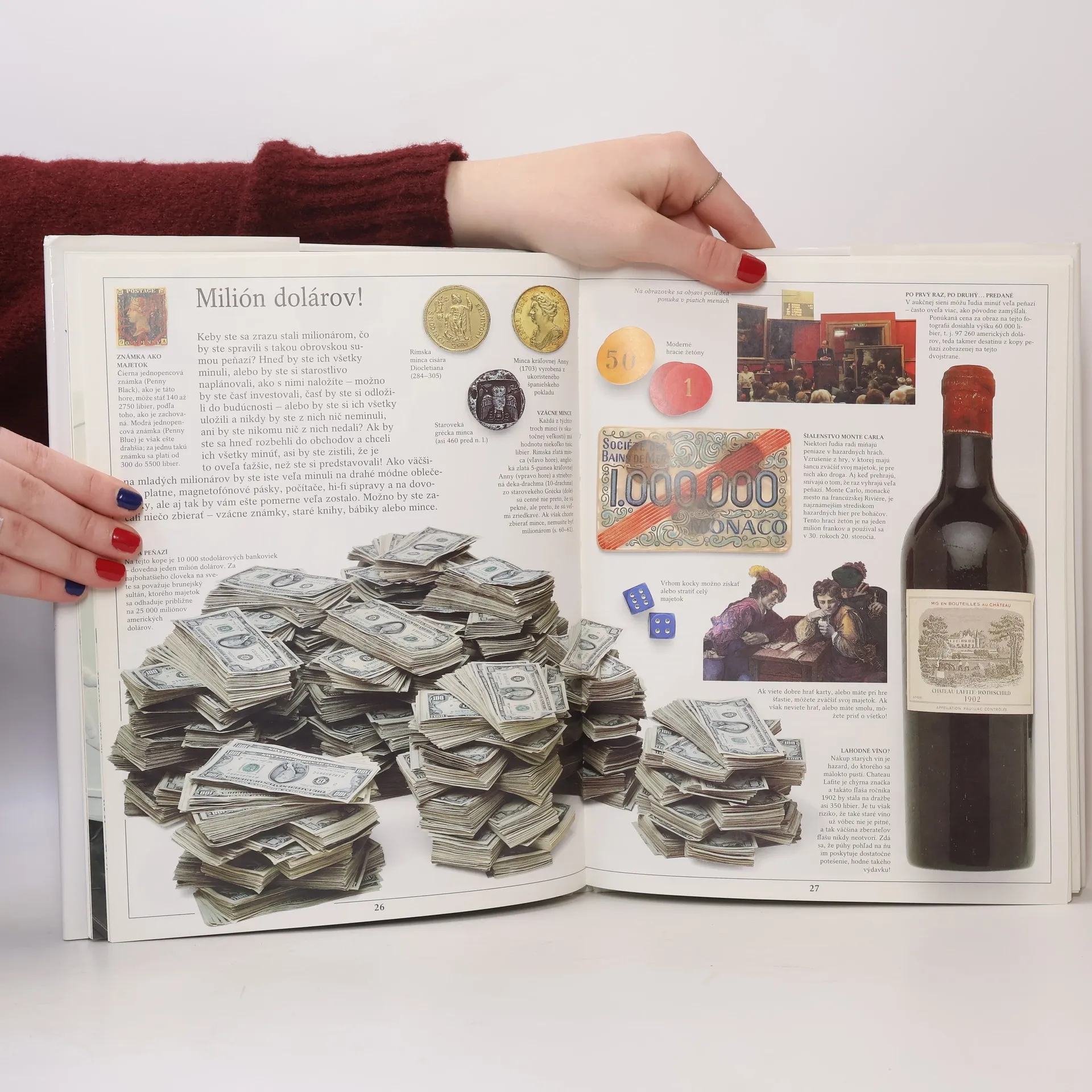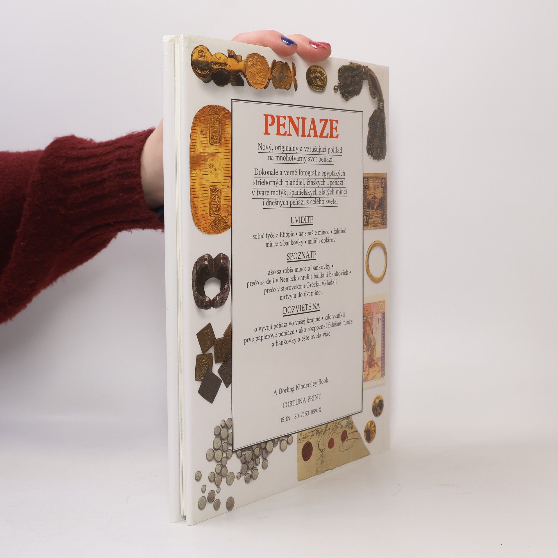 Spoznajte históriu peňazí od strieborných ingotov a mušlí až po moderné počítačové peniaze. Nový, originálny a vzrušujúci pohľad na mnohotvárny svet peňazí. Dokonalé a verné fotografie egyptských strieborných platidiel, čínskych peňazí v tvare motýk, španielskych zlatých mincí i dnešných peňazí z celého sveta. Uvidíte soľné tyče z Etiópie, najstaršie mince, falošné mince a bankovky, milión dolárov. Spoznáte ako sa robia mince a bankovky, prečo sa deti v Nemecku hrali s balíkmi bankoviek, prečo v starovekom Grécku vkladali mŕtvym do úst mincu. Dozviete sa o vývoji peňazí vo vašej krajine, kde vznikli prvé papierové peniaze, ako rozpoznať falošné mince a bankovky a ešte oveľa viac. Kapitoly: Toto sú peniaze, Smiešne peniaze ?, Prvé mince, Prvé papierové peniaze, Ako sa vyrábajú mince, Ako sa vyrábajú bankovky, Falšovanie a falzifikáty, Peniaze a obchod, Peniaze vo vojne, Moc peňazí, Milión dolárov !, Spojené štáty americké, Francúzsko, Nemecko, Holandsko a Belgicko, Taliansko, Španielsko a Portugalsko, Grécko a Turecko, Čechy, Morava, Slovensko/Uhorsko/, Korunová mena, Veľká Británia, Kanada, Austrália a Nový Zéland, Čína a Japonsko, Afrika, Starostlivosť o peniaze, Šeky a platobné karty, Zbieranie mincí, Peniaze celého sveta. Prvé vydanie.