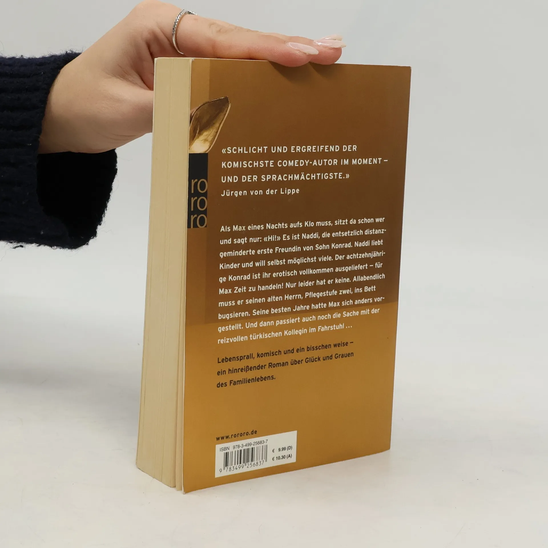 Als Max eines Nachts aufs Klo muss, sitzt da schon wer und sagt nur: «Hi!» Es ist Naddi, die entsetzlich distanzgeminderte erste Freundin von Sohn Konrad. Naddi liebt Kinder und will selbst möglichst viele. Der achtzehnjährige Konrad ist ihr erotisch vollkommen ausgeliefert – für Max Zeit zu handeln! Nur leider hat er keine. Allabendlich muss er seinen alten Herrn, Pflegestufe zwei, ins Bett bugsieren. Seine besten Jahre hatte Max sich anders vorgestellt. Und dann passiert auch noch die Sache mit der reizvollen türkischen Kollegin im Fahrstuhl… Lebensprall, komisch, und ein bisschen weise – ein hinreißender Roman über Glück und Grauen des Familienlebens.
