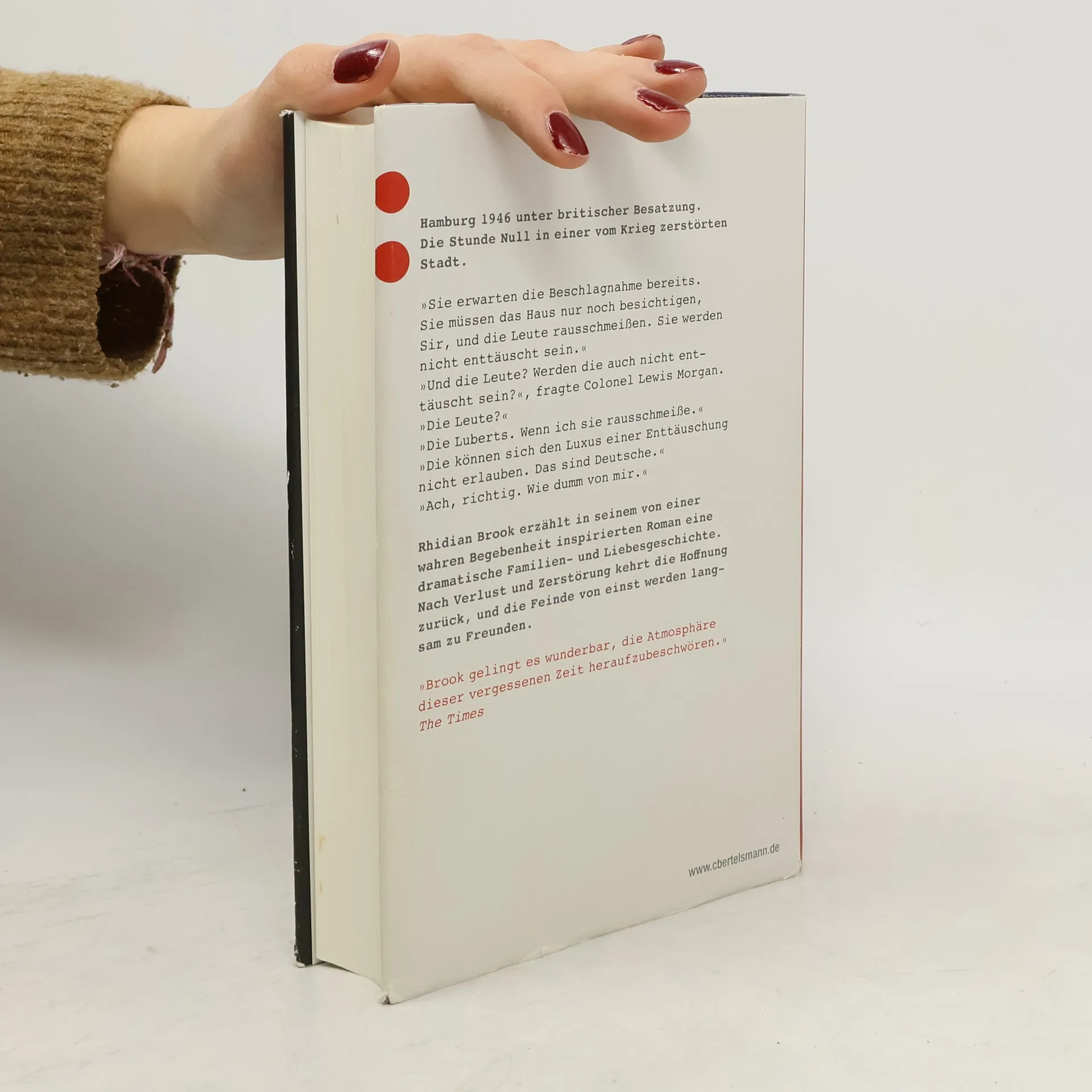 Hamburg 1946 – wenn aus Feinden Freunde werdenHamburg 1946: Ein englischer Offizier soll für die Entnazifizierung und den Wiederaufbau Deutschlands sorgen. Colonel Lewis Morgan wird mit seiner Familie in ein herrschaftliches Haus an der Elbe einquartiert. Seine Frau kann aber nicht verstehen, dass der Hausbesitzer Stefan Lubert nicht ausziehen muss. Sie findet die Idee, mit dem Feind unter einem Dach zu wohnen, unerträglich. Doch als sie den Alltag teilen, erkennt sie, wie grob und falsch ihr Bild von den Deutschen war. Nach und nach entwickelt sich eine unerhörte Nähe zwischen ihr und Stefan Lubert …Ein selten beschriebenes Kapitel deutscher Geschichte – Rhidian Brook zeichnet ein enorm differenziertes Bild von einem Land, das am Boden liegt, von einer verstörten Bevölkerung, aber auch von dem Hoffnungsschimmer nach Tod und Vernichtung. Ein Roman von größter Intensität.