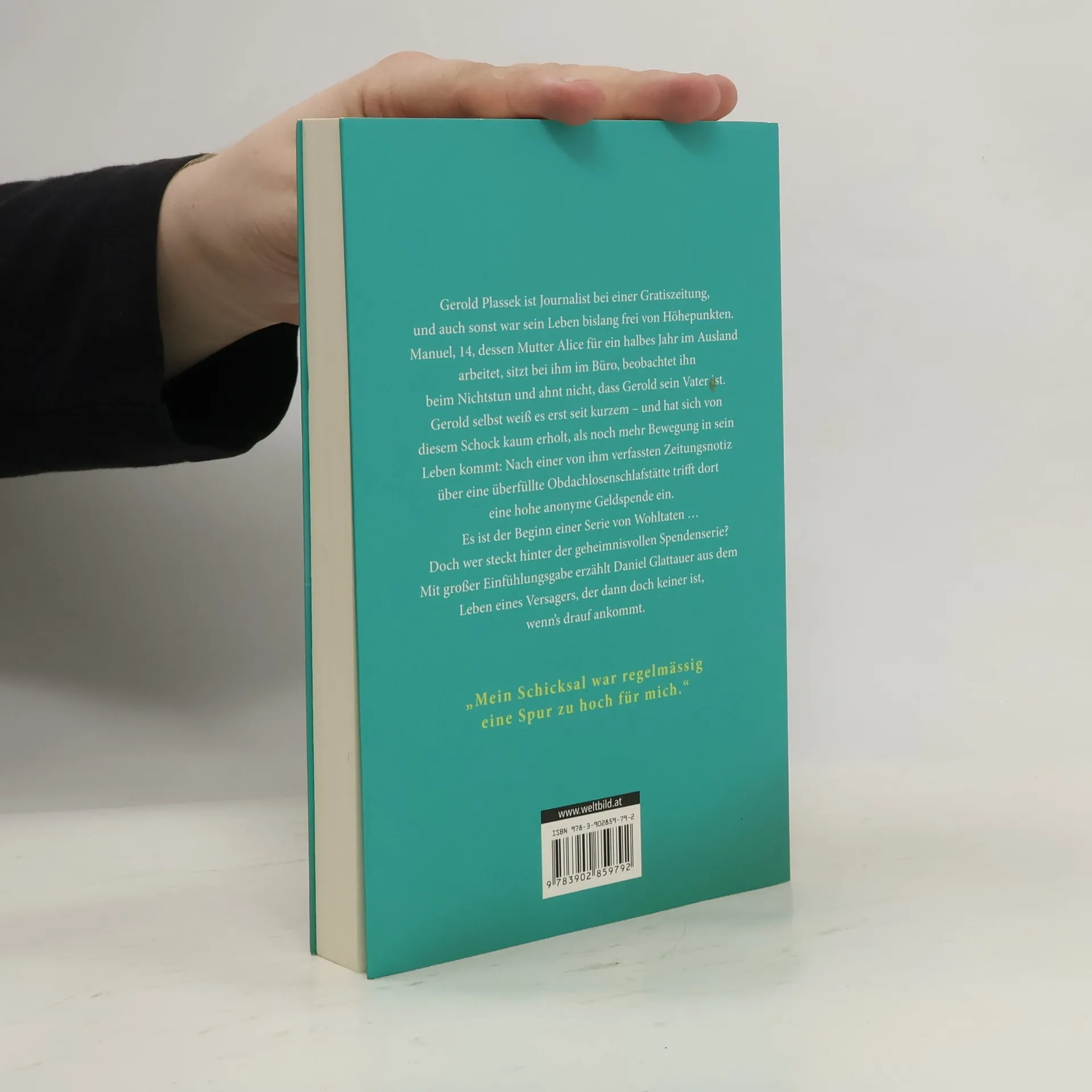 Gerold Plassek ist Journalist bei einer Gratiszeitung. Bei ihm im Büro sitzt der 14-jährige Manuel, dessen Mutter im Ausland arbeitet. Er beobachtet Gerold beim Nichtstun und ahnt nicht, dass dieser Versager sein Vater ist. Gerold fehlt jeder Antrieb, die Stammkneipe ist sein Wohnzimmer und der Alkohol sein verlässlichster Freund. Plötzlich kommt Bewegung in sein Leben: Nach dem Erscheinen seines Artikels über eine überfüllte Obdachlosenschlafstätte trifft dort eine anonyme Geldspende ein. Das ist der Beginn einer Serie von Wohltaten, durch die Gerold immer mehr in den Blickpunkt der Öffentlichkeit rückt. Und langsam beginnt auch Manuel, ihn zu mögen ... - Ein so spannender wie anrührender Roman, der auf einer wahren Begebenheit beruht.