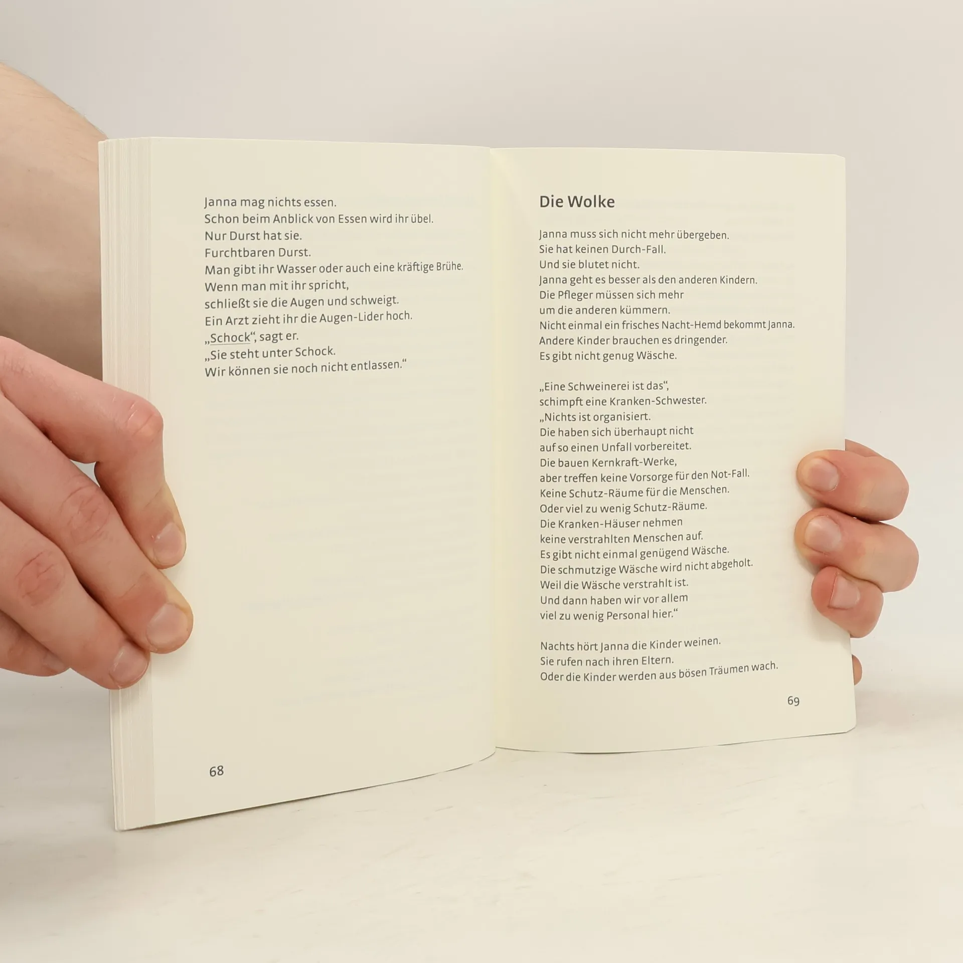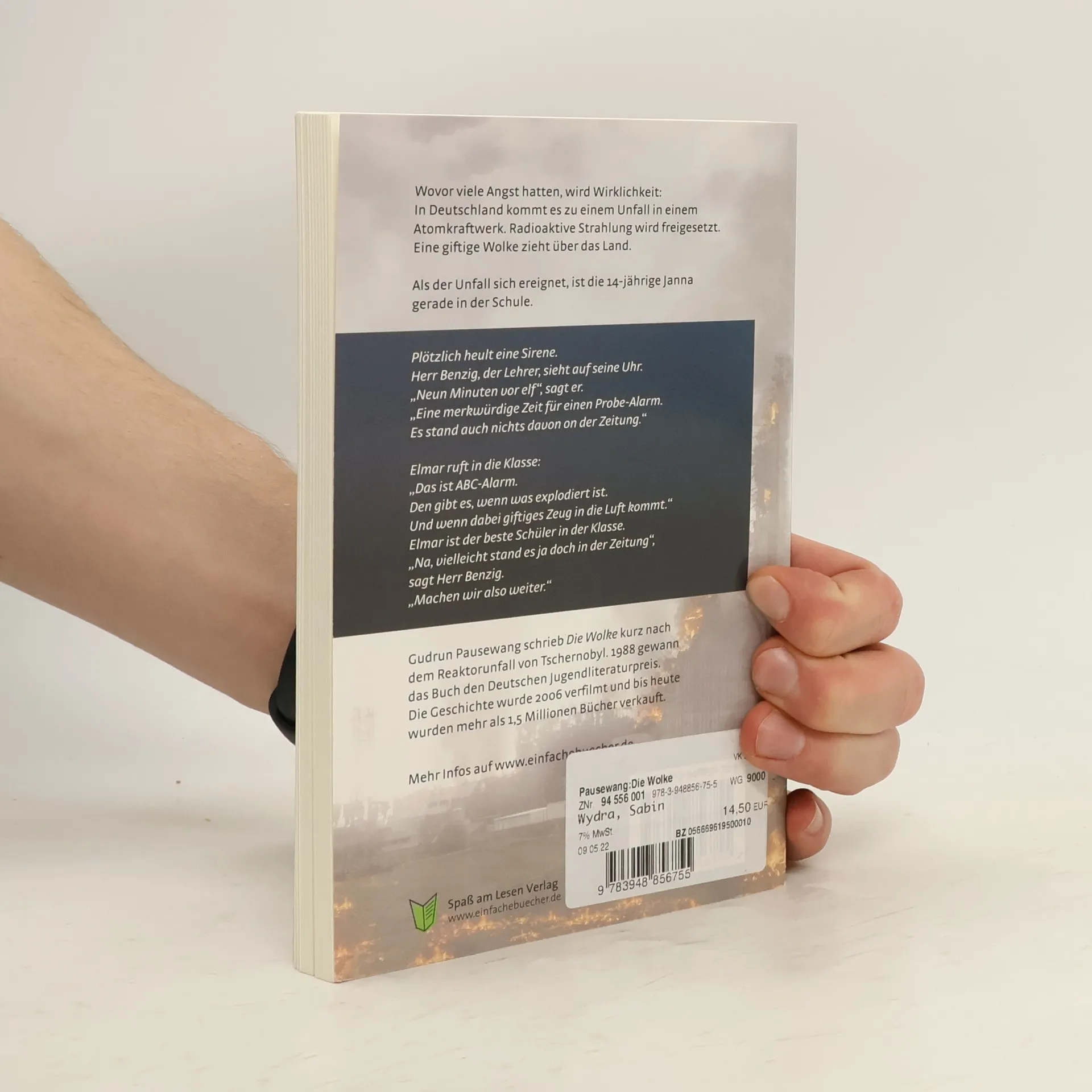Wovor viele Angst hatten, wird Wirklichkeit: In Deutschland kommt es zu einem Unfall in einem Atomkraftwerk. Radioaktive Strahlung wird freigesetzt. Eine giftige Wolke zieht über das Land. Als der Unfall sich ereignet, ist die 14-jährige Janna gerade in der Schule. Plötzlich heult eine Sirene. Herr Benzig, der Lehrer, sieht auf seine Uhr. „Neun Minuten vor elf“, sagt er. „Eine merkwürdige Zeit für einen Probe-Alarm. Es stand auch nichts davon on der Zeitung.“ Elmar ruft in die Klasse: „Das ist ABC-Alarm. Den gibt es, wenn was explodiert ist. Und wenn dabei giftiges Zeug in die Luft kommt.“ Elmar ist der beste Schüler in der Klasse. „Na, vielleicht stand es ja doch in der Zeitung“, sagt Herr Benzig. „Machen wir also weiter.“ Gudrun Pausewang schrieb Die Wolke kurz nach dem Reaktorunfall von Tschernobyl. 1988 gewann das Buch den Deutschen Jugendliteraturpreis. Die Geschichte wurde 2006 verfilmt und bis heute wurden mehr als 1,5 Millionen Bücher verkauft.