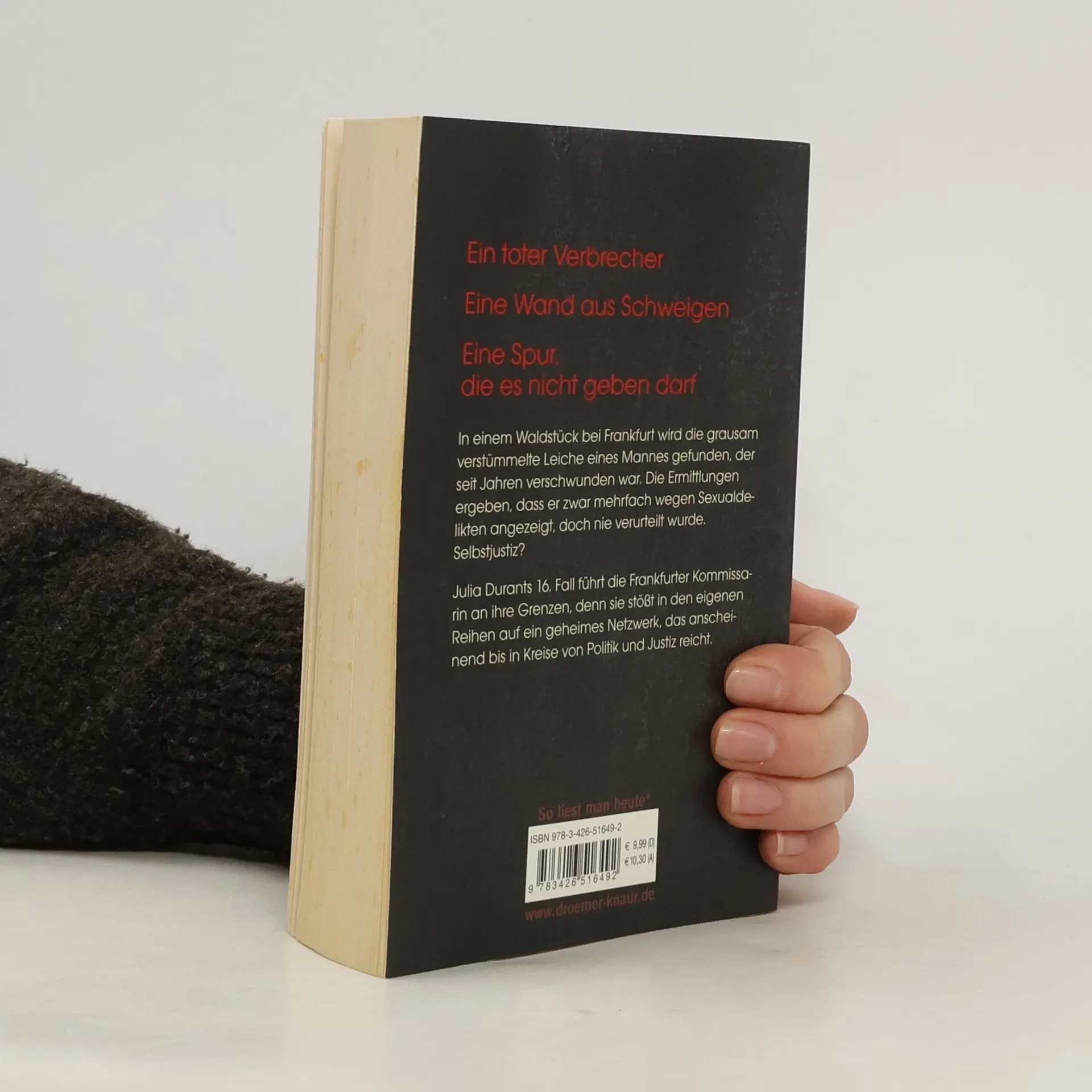 In einem Waldstück bei Frankfurt wird die Leiche eines Sexualstraftäters gefunden, der seit Jahren als vermisst galt. Die Ermittlungen ergeben, dass der Mann zwar mehrfach verdächtigt, doch nie verurteilt wurde. In den Akten tauchen immer wieder derselbe Richter und dieselben Anwälte auf – Zufall? Die brutalen Verletzungen des Mordopfers lassen auf ein sehr persönliches Motiv schließen. Und auf große Wut. Und während Julia Durant sich noch mit der Frage herumschlägt, wem sie hier eigentlich zu Gerechtigkeit verhilft, muss sie erkennen, dass ihr der Gegenwind auch aus den eigenen Reihen entgegenschlägt.