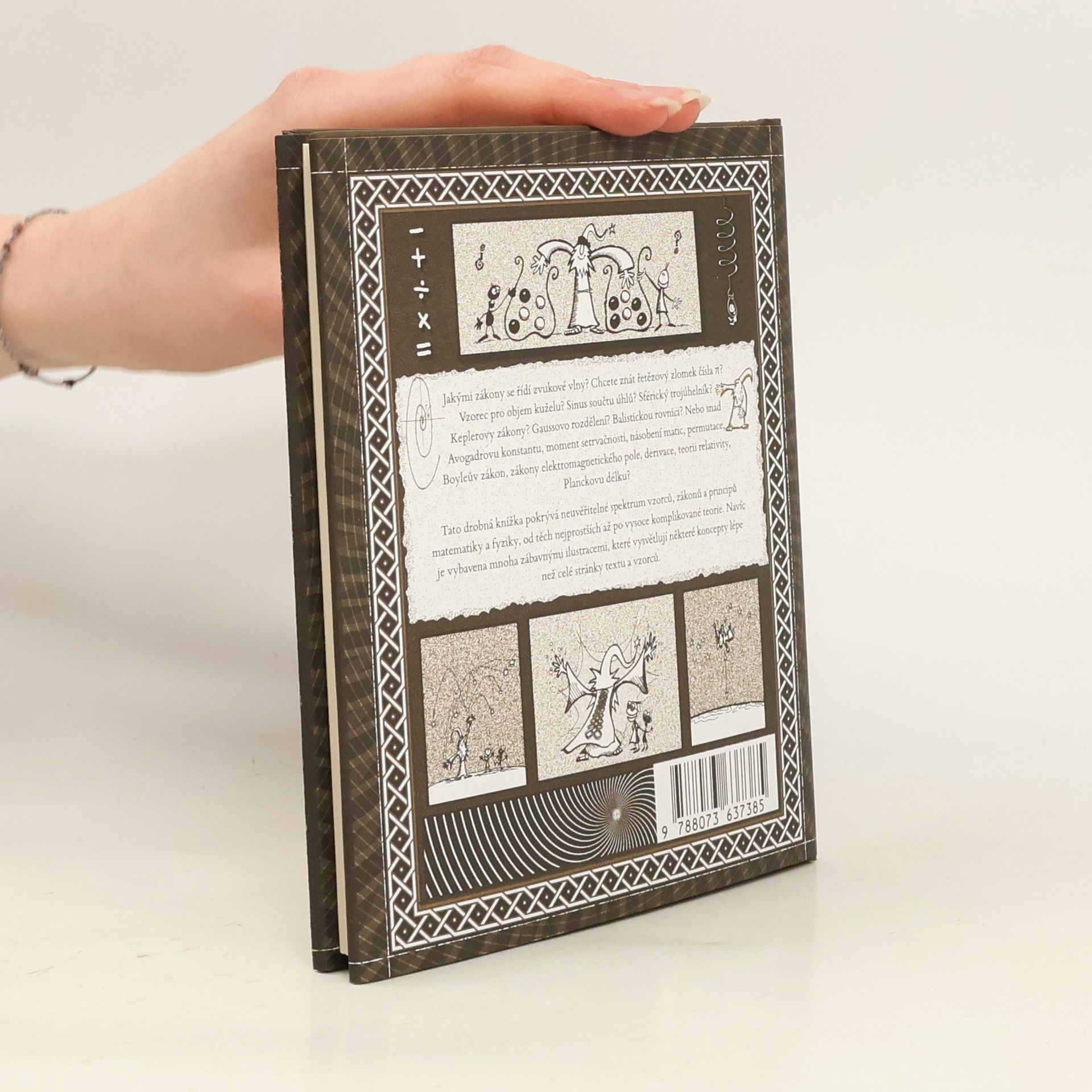 V této útlé a půvabné knize shrnují matematik Matthew Watkins a ilustrátor Matt Tweed základní vzorce z matematiky a fyziky v sympatické a snadno pochopitelné podobě. Pokud byste si rádi osvěžili trigonometrii, gravitační zákony, teorii relativity, něco ze statistiky nebo matematické analýzy a řady dalších oborů, jste na správné adrese. Jestli takovou potřebu nemáte, jen zalistujte a potěšte se největšími výtvory lidského ducha za poslední 3 tisíciletí v hutné podobě rovnic, které jsou esteticky působivé samy o sobě, a vtipné kresby tuto jejich vlastnost jen zdůrazňují. Kniha je kompaktní sbírkou formulí a základních pojmů z matematiky a fyziky, která vám pomůže rychle se zorientovat i v problémech, o nichž jste dosud neměli ani tušení.