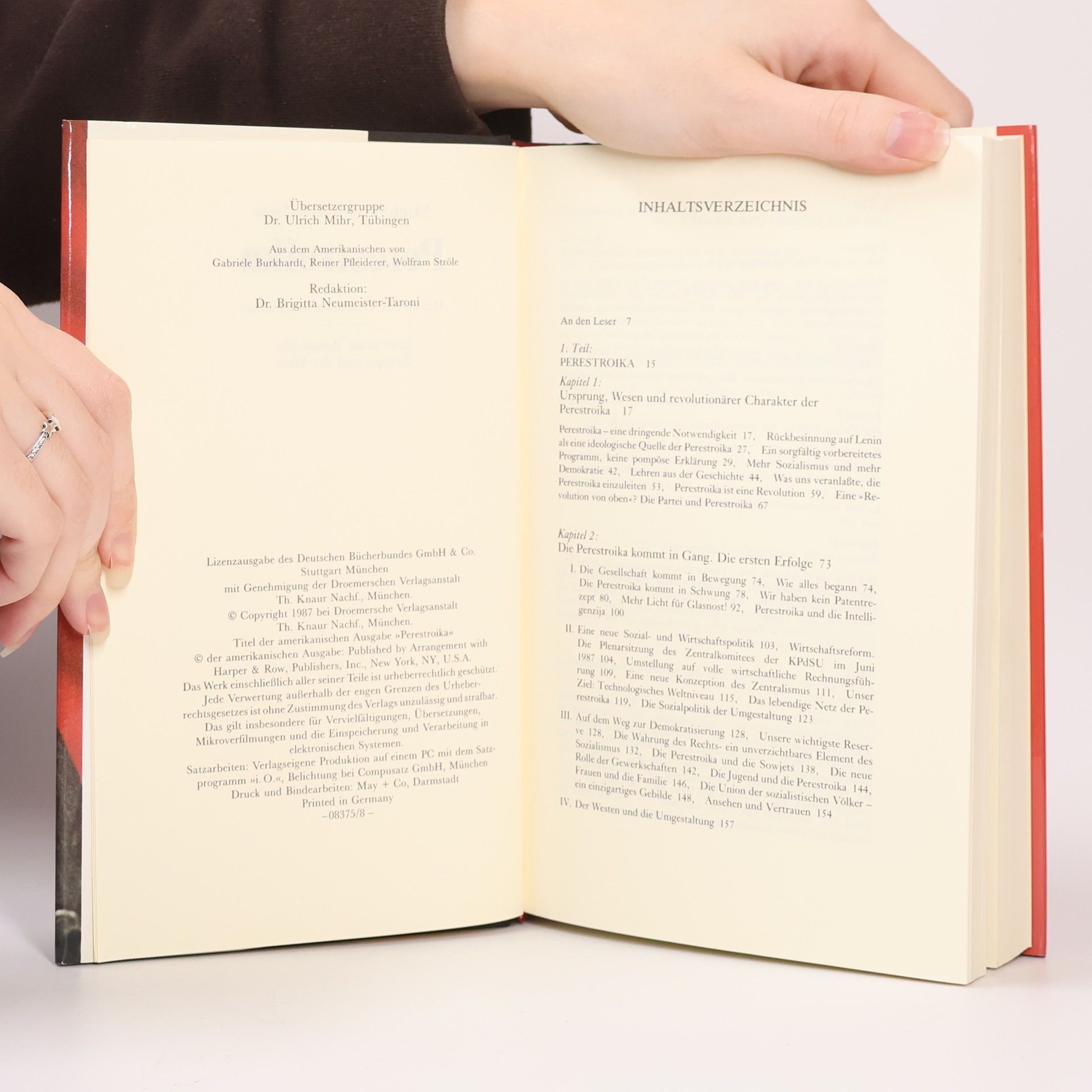 In diesem Buch - 1987 zustandegekommen u.a. auf Bitten eines amerikanischen Verlages - legt der (seit 1985 amtierende) Generalsekretär der KPdSU Wege und Ziele für eine radikale Umgestaltung der sowjetischen Gesellschaft sowie Konzepte einer neuen Politik für Europa und die Welt dar