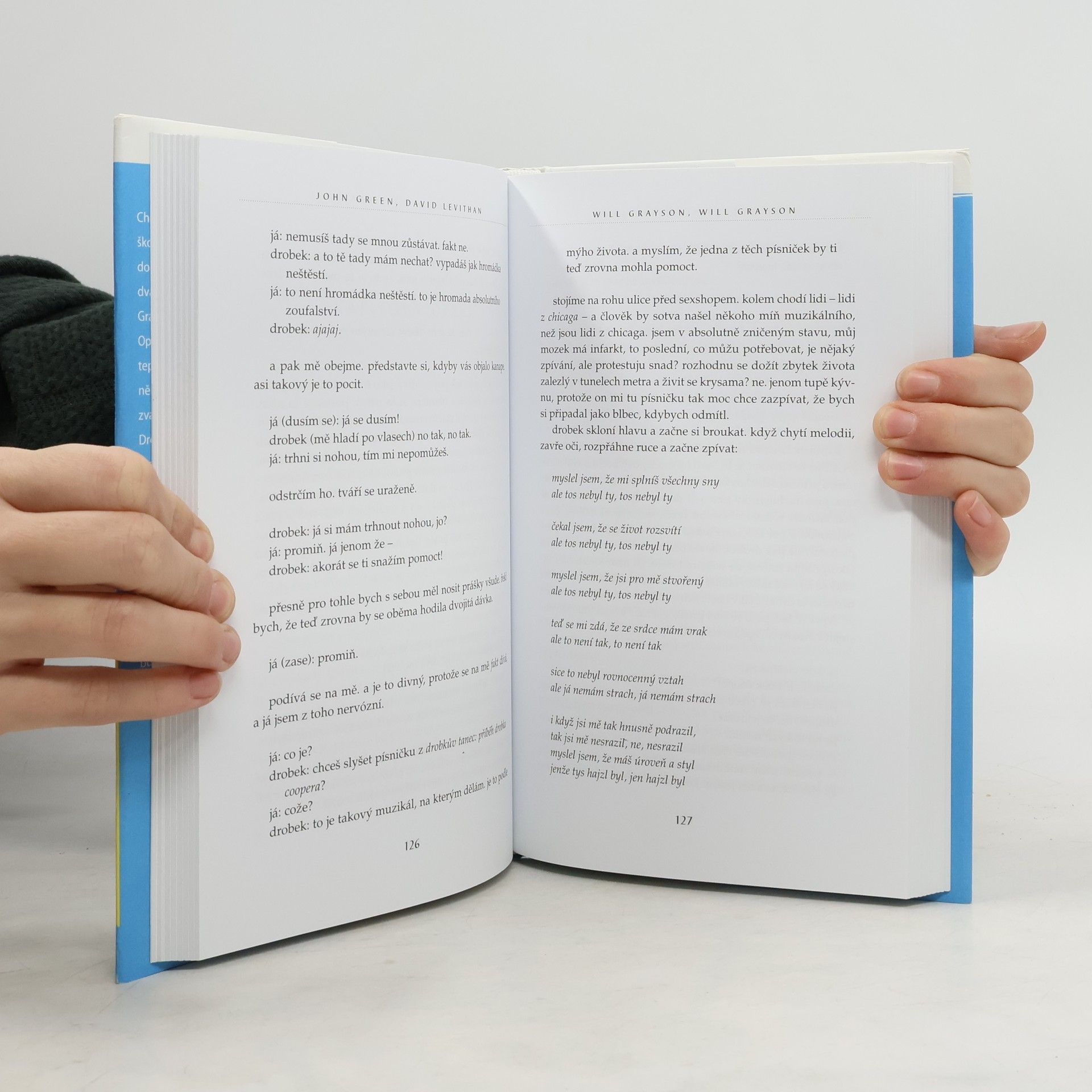 Will Grayson a Will Grayson jsou dva naprosto rozdílní kluci, kteří spolu (kromě jména) nemají vůbec nic společného. Dokonce se ani neznají. Pak se jednoho dne náhodou setkají... Chicago je dost velké město a dva středoškoláky z jeho opačných konců může dohromady svést leda náhoda. A aby se navíc ti dva jmenovali úplně stejně, totiž Will Grayson, musí ta náhoda být hodně veliká. Jenže opravdový spád věci naberou teprve tehdy, když se do všeho vloží ještě někdo třetí – kamarád jednoho z Willů zvaný Drobek, tornádo v lidské podobě. Drobek je střední útočník školního týmu amerického fotbalu, autor, skladatel, producent, režisér a hlavní hvězda nejlepšího muzikálu všech dob, a především věčně zamilovaný gay. A když ten se do něčeho pustí, můžete si být jistí, že při zdi se držet nebude… Oba Willy čeká řada příjemných i méně příjemných překvapení a postupně si budou muset znovu přebrat všechno, co si mysleli o sobě, o lásce i o přátelství.