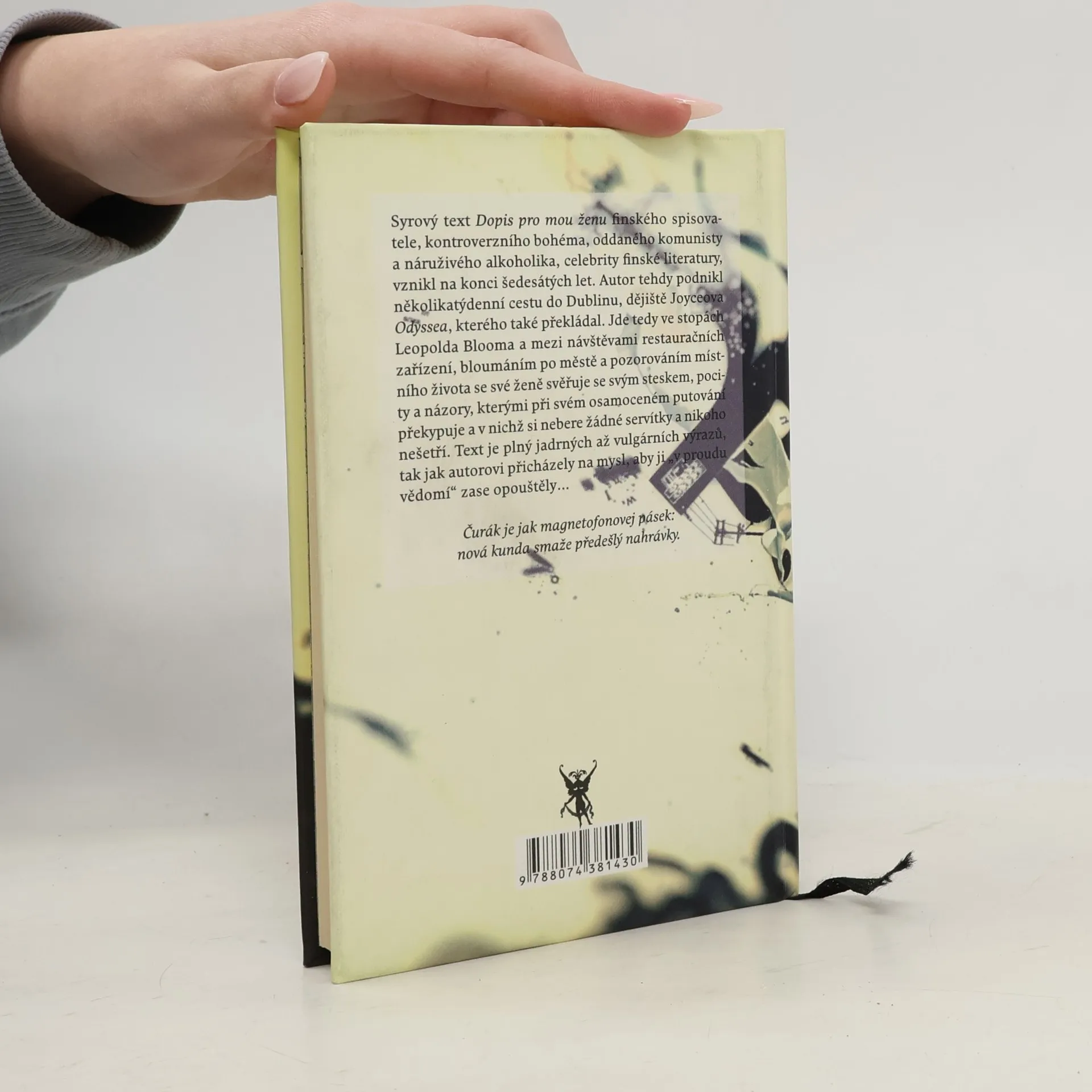 Syrový text Dopis pro mou ženu finského spisovatele, kontroverzního bohéma, oddaného komunisty a náruživého alkoholika, celebrity finské literatury, vznikl na konci šedesátých let. Autor tehdy podnikl několikatýdenní cestu do Dublinu, dějiště Joyceova Odyssea, kterého také překládal. Jde tedy ve stopách Leopolda Blooma a mezi návštěvami restauračních zařízení, bloumáním po městě a pozorováním místního života se své ženě svěřuje se svým steskem, pocity a názory, kterými při svém osamoceném putování překypuje a v nichž si nebere žádné servítky a nikoho nešetří. Text je plný jadrných až vulgárních výrazů, tak jak autorovi přicházely na mysl, aby ji „v proudu vědomí“ zase opouštěly...
