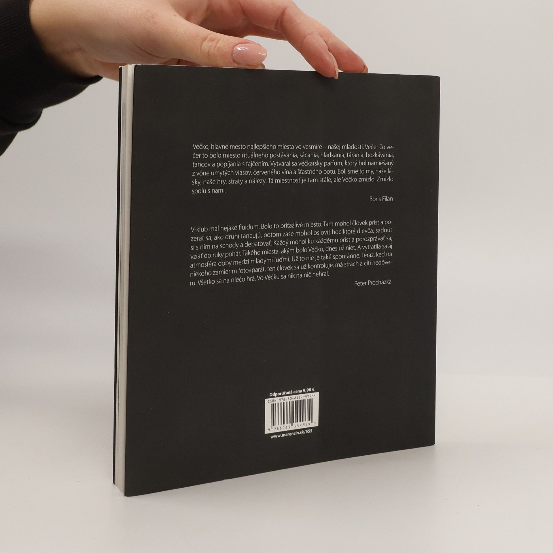 Véčko, hlavné mesto najlepšieho miesta vo vesmíre – našej mladosti. Večer čo večer to bolo miesto rituálneho postávania, sácania, hladkania, tárania, bozkávania, tancov a popíjania s fajčením. Vytváral sa véčkarsky parfum, ktorý bol namiešaný z vône umytých vlasov, červeného vína a šťastného potu. Boli sme to my, naše lásky, naše hry, straty a nálezy. Tá miestnosť je tam stále, ale Véčko zmizlo. Zmizlo spolu s nami. Boris Filan V-klub mal nejaké fluidum. Bolo to príťažlivé miesto. Tam mohol človek prísť a pozerať sa, ako druhí tancujú, potom zase mohol osloviť hociktoré dievča, sadnúť si s ním na schody a debatovať. Každý mohol ku každému prísť a porozprávať sa, vziať do ruky pohár. Takého miesta, akým bolo Véčko, dnes už niet. A vytratila sa aj atmosféra doby medzi mladými ľuďmi. Už to nie je také spontánne. Teraz, keď na niekoho zamierim fotoaparát, ten človek sa už kontroluje, má strach a cíti nedôveru. Všetko sa na niečo hrá. Vo Véčku sa nik na nič nehral.