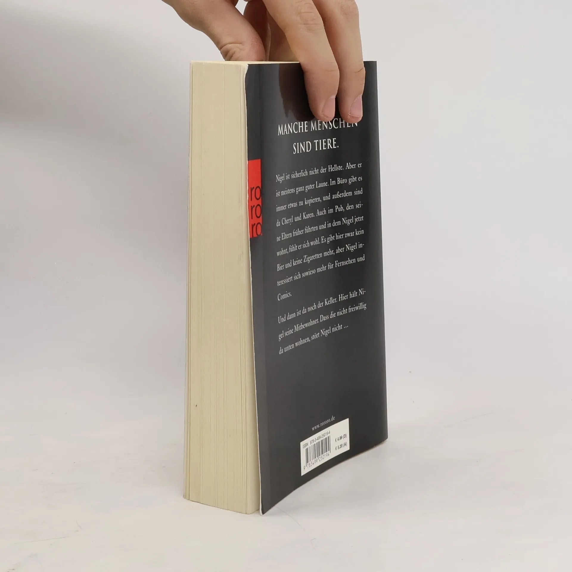 Manche Menschen sind Tiere. Nigel ist sicherlich nicht der Hellste. Aber er ist meistens ganz guter Laune. Im Büro gibt es immer etwas zu kopieren, und außerdem sind da Cheryl und Karen. Auch im Pub, den seine Eltern früher führten und in dem Nigel jetzt wohnt, fühlt er sich wohl. Es gibt hier zwar kein Bier und keine Zigaretten mehr, aber Nigel interessiert sich sowieso mehr für Fernsehen und Comics. Und dann ist da noch der Keller. Hier hält Nigel seine Mitbewohner. Dass die nicht freiwillig da unten wohnen, stört Nigel nicht …