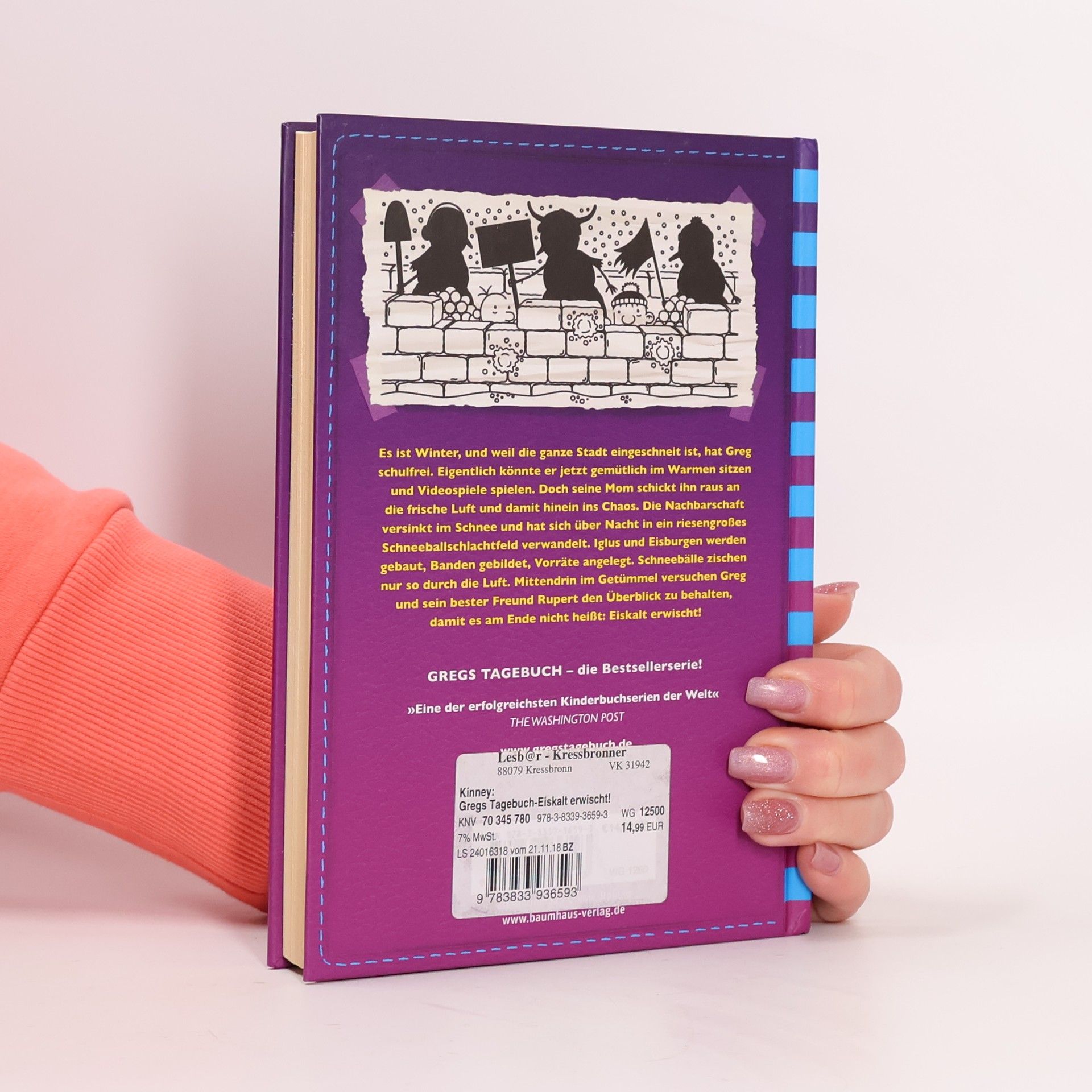 Es ist Winter, und weil die ganze Stadt eingeschneit ist, hat Greg schulfrei. Eigentlich könnte er jetzt gemütlich im Warmen sitzen und Videospiele spielen. Doch seine Mom schickt ihn raus an die frische Luft und damit hinein ins Chaos. Die Nachbarschaft versinkt im Schnee und hat sich über Nacht in ein riesengroßes Schneeballschlachtfeld verwandelt. Iglus und Eisburgen werden gebaut, Banden gebildet, Vorräte angelegt. Schneebälle zischen nur so durch die Luft. Mittendrin im Getümmel versuchen Greg und sein bester Freund Rupert den Überblick zu behalten, damit es am Ende nicht heißt: Eiskalt erwischt!