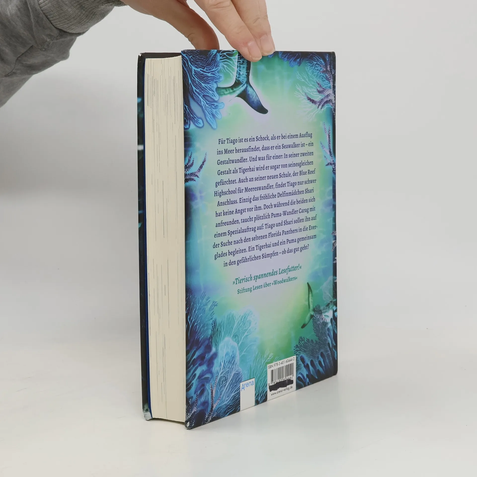 Willkommen an der Blue Reef High: Die Gestaltwandler-Schule für Meerestiere öffnet ihre Pforten! Tiago ist geschockt, als er entdeckt, dass er ein Gestaltwandler ist – und zwar ein gefährlicher Tigerhai. Während seine Mitschüler Angst vor ihm haben, sucht nur das fröhliche Delfinmädchen Shari Kontakt zu ihm. Doch ihre Freundschaft wird auf die Probe gestellt, als sie gemeinsam ein aufregendes Abenteuer erleben. Bei einem Ausflug ins Meer wird Tiago mit seiner neuen Identität konfrontiert, die sein Leben auf den Kopf stellt. Die Suche nach Anschluss gestaltet sich schwierig, bis Shari mit ihrem mutigen Herzen ihm näherkommt. Plötzlich taucht Puma-Wandler Carag auf, der einen Notruf aus den Everglades erhalten hat. Tiago und Shari begleiten ihn auf der Suche nach den seltenen Florida Panthers. Ein Tigerhai und ein Puma in den gefährlichen Sümpfen – ob das gut geht? Fans der Woodwalkers-Serie dürfen sich auf die zweite Staffel von Bestseller-Autorin Katja Brandis freuen. In der faszinierenden Unter- und Überwasserwelt der Everglades erleben Tiago und seine Gestaltwandler-Freunde – darunter Delfinwandlerin Shari und Gürteltierwandler Jasper – spannende Abenteuer. Mit wunderschönen Illustrationen von Claudia Carls ist dieser Lesestoff für Jungen und Mädchen ab 10 Jahren geeignet. Alle Seawalkers-Bände sind unabhängig von den Woodwalkers lesbar.