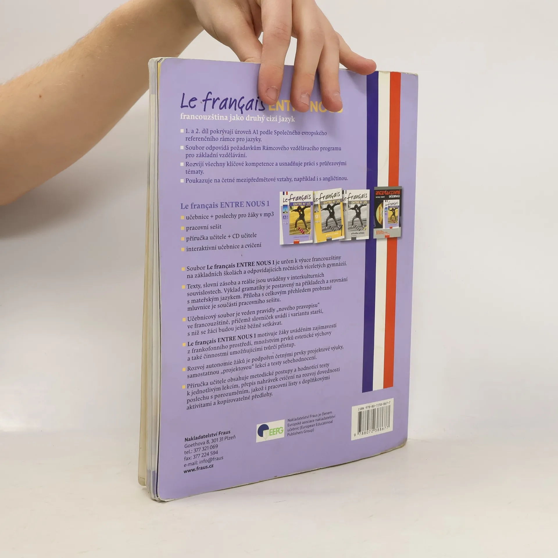 Dvoudílný soubor učebnic je určen pro výuku francouzštiny jako dalšího cizího jazyka v 8. (resp. 7.) ročníku základních škol a odpovídajících ročnících víceletých gymnázií, pokrývající úroveň A1 podle SERR. Na stránce 6 se dozvíte o deseti důvodech, proč se učit francouzsky, přičemž první díl je v češtině a druhý ve francouzštině, což usnadňuje orientaci v textu. Název učebnice, Le français ENTRE NOUS, zdůrazňuje význam francouzštiny v současném světě a zaměření na skutečnou komunikaci ve třídě. Učebnice je zábavným a užitečným nástrojem pro získávání znalostí o frankofonní kultuře a Evropské unii, a také pro rozvoj komunikačních dovedností. Mezi přednosti učebnice patří vedení podle pravidel "nového pravopisu" ve francouzštině, přičemž slovníček zahrnuje i starší variantu. Důraz je kladen na postupné osvojování zvukové stránky francouzštiny a na mezipředmětové vztahy, zejména s angličtinou. Obsahuje podněty pro interkulturní výchovu a využívá prvky projektového vyučování. Učebnice je dostupná v interaktivní podobě pro tabule, tablety, PC a notebooky. K dispozici je také zdarma aplikace WordTrainer FRAUS pro procvičování slovní zásoby z jednotlivých lekcí.