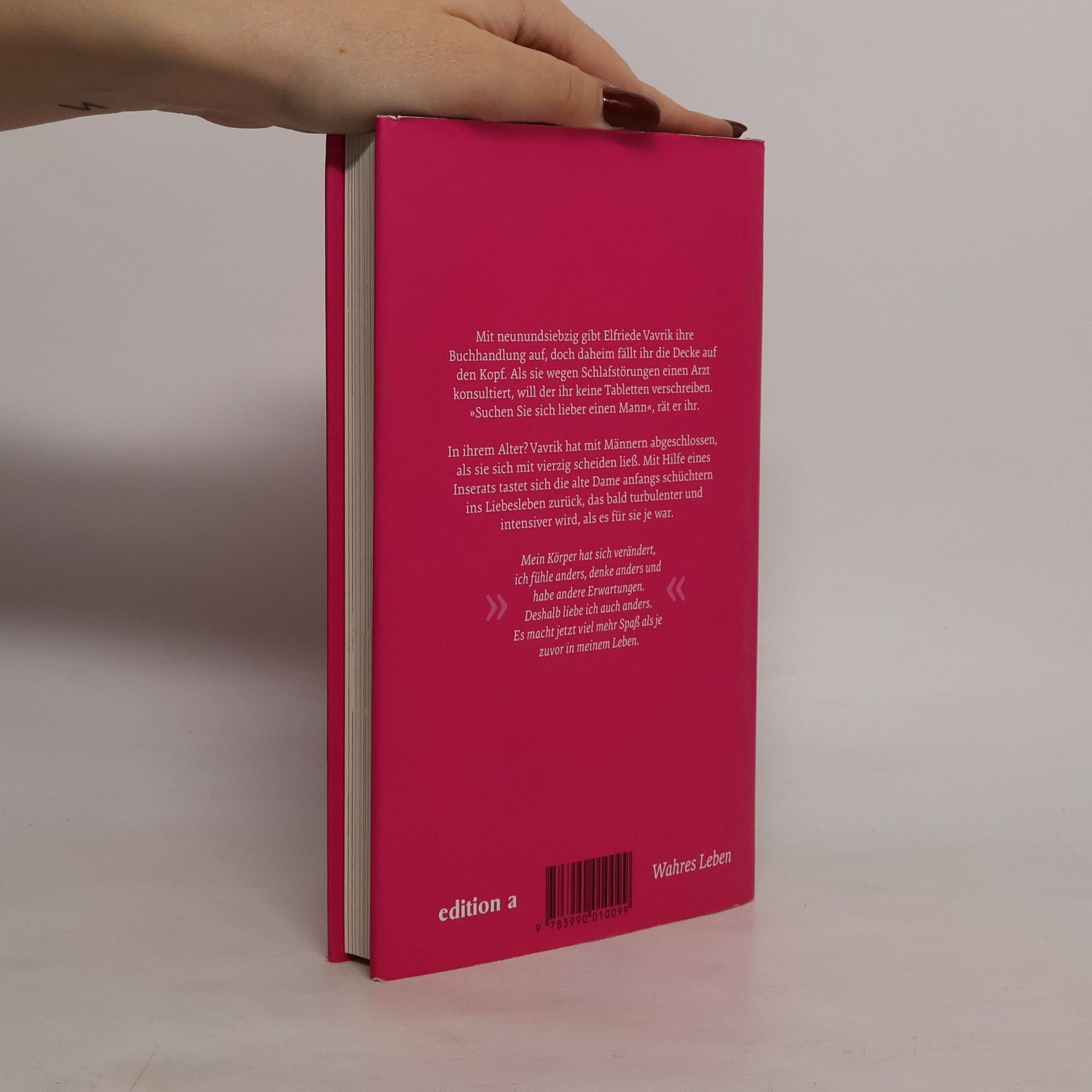 Mit neunundsiebzig gibt Elfriede Vavrik ihre Buchhandlung auf, doch daheim fällt ihr die Decke auf den Kopf. Als sie wegen Schlafstörungen einen Arzt konsultiert, will der ihr keine Tabletten verschreiben. 'Suchen Sie sich lieber einen Mann', rät er ihr. In ihrem Alter? Vavrik hat mit Männern abgeschlossen, als sie sich mit vierzig scheiden ließ. Mit Hilfe eines Inserats tastet sich die alte Dame anfangs schüchtern ins Liebesleben zurück, das bald turbulenter und intensiver wird, als es für sie je war.