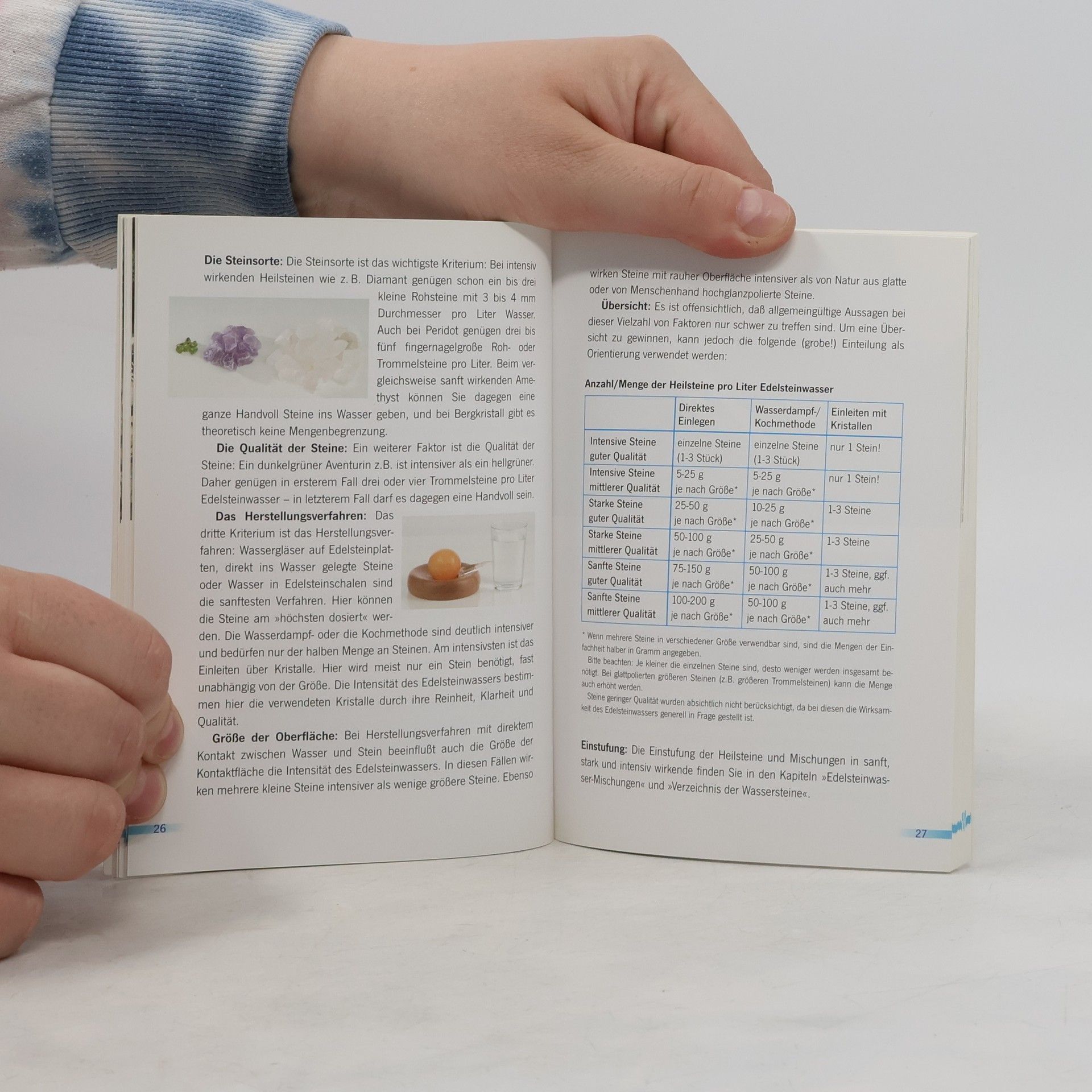 Sardonyxwasser gegen Tinnitus, Chrysopraswasser zur Entgiftung und Entschlackung, Smaragdwasser bei Entzündungen, Aquamarinwasser bei Allergien… Die Liste der Edelsteinwasser, die erfolgreich bei Beschwerden und Erkrankungen unterschiedlichster Art eingesetzt werden, ist lang - und wird ständig länger! Nachdem die äußere Anwendung, das Tragen und Auflegen von Heilsteinen, in der Steinheilkunde lange Zeit dominierend war, wenden sich viele Menschen heute der inneren Einnahme in Form von Edelsteinelixieren und Edelsteinwasser zu. Auch zur Trinkwasserverbesserung werden Edelsteine inzwischen gerne verwendet. In vielen Haushalten finden sich Wasserkrüge mit der einstmals in einer 'Fliege-Talkshow' propagierten 'Grundmischung' aus Amethyst, Bergkristall und Rosenquarz. Beliebt ist auch die Mischung bunter Calcite, welche die Verdauung fördern soll. Nach einigen Grundlagen - in aller Kürze! - werden vorab die Edelsteine genannt, die wegen ihrer giftigen oder gesundheitlich abträglichen Absonderungen keinesfalls verwendet dürfen, anschließend werden 96 Wassersteine von A - Z und ihre spezifischen Wirkungen vorgestellt. Ein Buch, das die Leser des Grundwerkes 'Edelsteinwasser' derselben Autoren nicht unbedingt brauchen, aber hoffentlich vielen, denen das für den Einstieg zu gewichtig war, einen leichten und gleichwohl fundierten Einstieg erlauben.