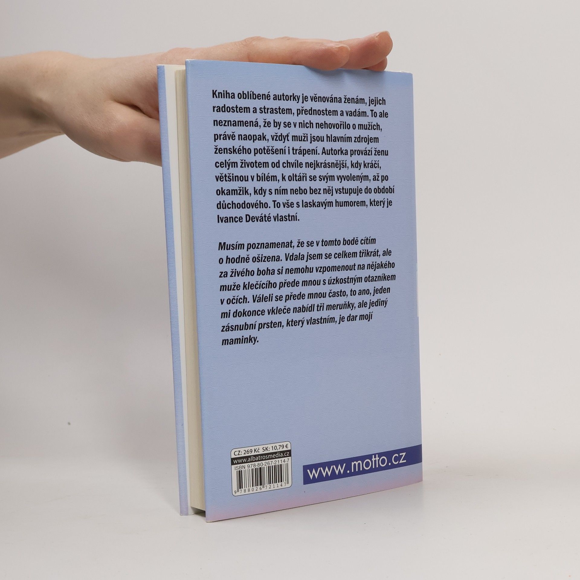 Kniha oblíbené autorky je věnována ženám, jejich radostem a strastem, přednostem a vadám. Autorka provází ženu celým životem od chvíle nejkrásnější, kdy kráčí, většinou v bílém, k oltáři se svým vyvoleným, až po okamžik, kdy s ním nebo bez něj vstupuje do období důchodového.