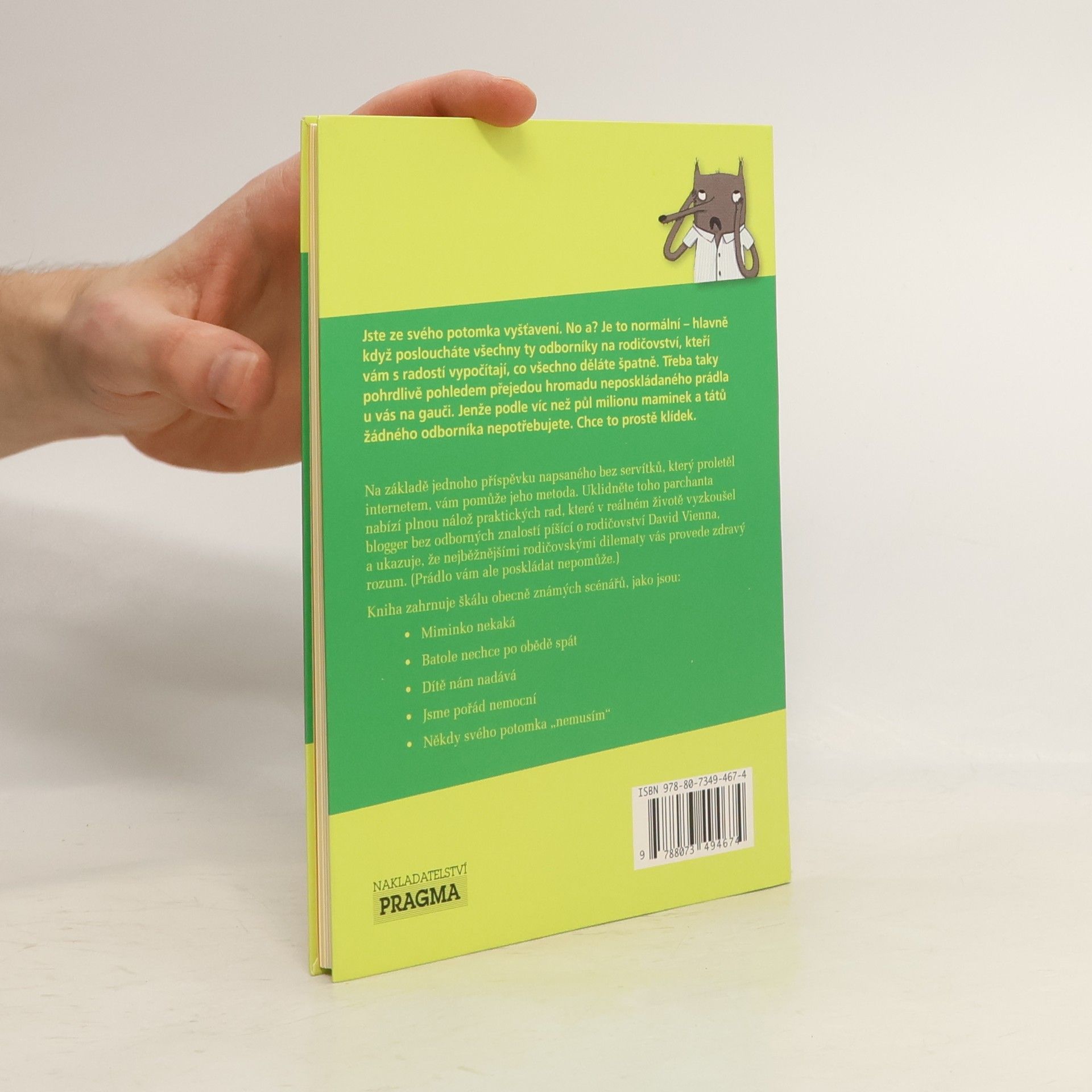 Uklidněte toho parchanta - Jediná kniha, kterou budou rodiče potřebovat. Jste ze svého potomka vyšťaveni. No a? Je to normální - hlavně když posloucháte všechny ty odborníky na rodičovství, kteří vám s radostí vypočítají, co všechno děláte špatně. Třeba taky pohrdlivě pohledem přejedou hromadu neposkládaného prádla u vás na gauči. Jenže podle víc než půl milionu maminek a tátů žádného odborníka nepotřebujete. Chce to prostě klídek. Na základě jednoho příspěvku napsaného bez servítků, který proletěl internetem, vám pomůže jeho metoda. Uklidněte toho parchanta nabízí plnou nálož praktických rad, které v reálném životě vyzkoušel blogger bez odborných znalostí píšící o rodičovství David Vienna, a ukazuje, že nejběžnějšími rodičovskými dilematy vás provede zdravý rozum. ( Prádlo vám ale poskládat nepomůže. ) Kniha zahrnuje škálu obecně známých scénářů, jako jsou: Miminko nekaká Batole nechce po obědě spát Dítě nám nadává Jsme pořád nemocní Někdy svého potomka "nemusím"