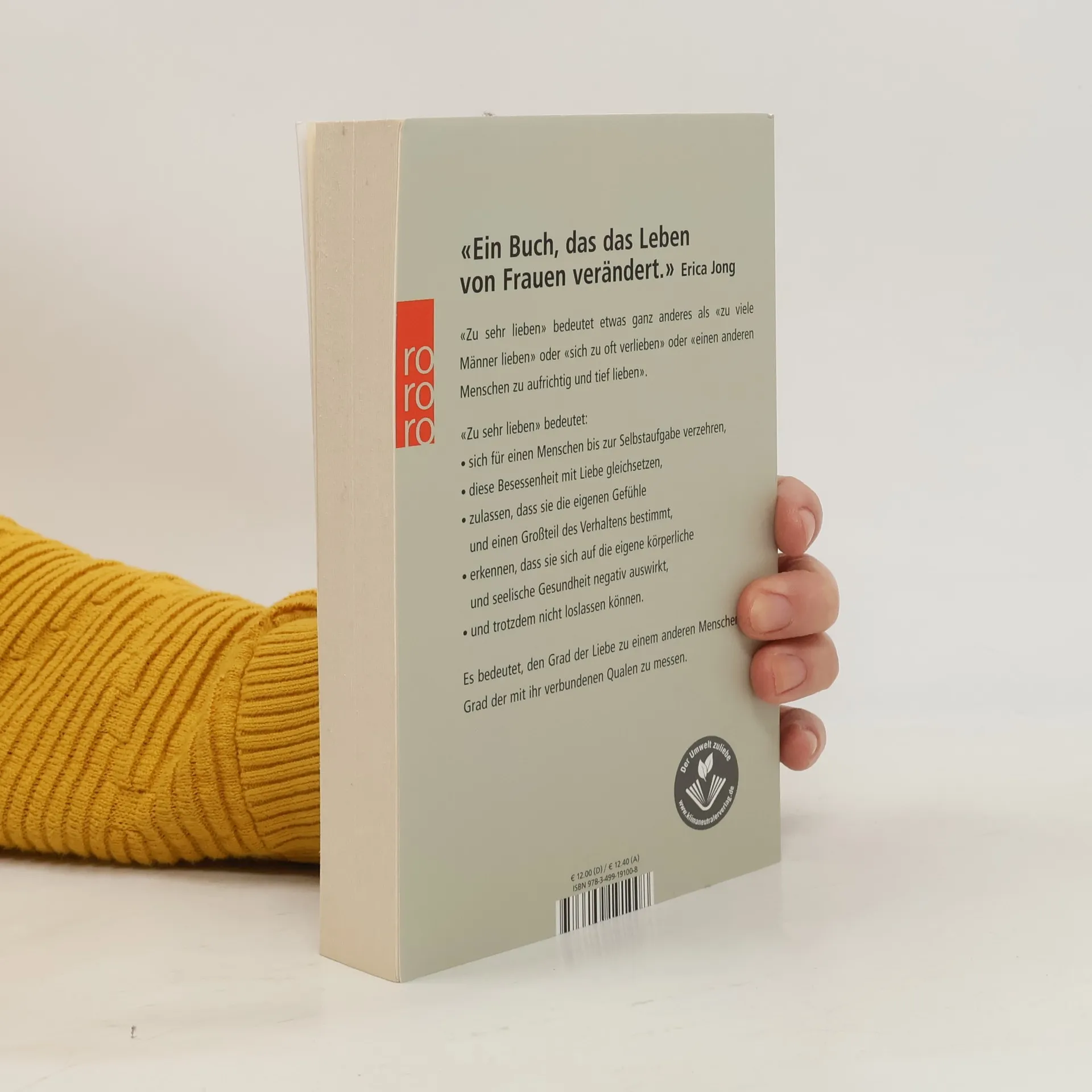 «Ein Buch, das das Lebenvon Frauen verändert.» Erica Jong«Zu sehr lieben» bedeutet etwas ganz anderes als «zu viele Männer lieben» oder «sich zu oft verlieben» oder «einen anderen Menschen zu aufrichtig und tief lieben».«Zu sehr lieben» bedeutet:• sich für einen Menschen bis zur Selbstaufgabe verzehren,• diese Besessenheit mit Liebe gleichsetzen,• zulassen, dass sie die eigenen Gefühleund einen Großteil des Verhaltens bestimmt,• erkennen, dass sie sich auf die eigene körperlicheund seelische Gesundheit negativ auswirkt,• und trotzdem nicht loslassen können.Es bedeutet, den Grad der Liebe zu einem anderen Menschen am Grad der mit ihr verbundenen Qualen zu messen.