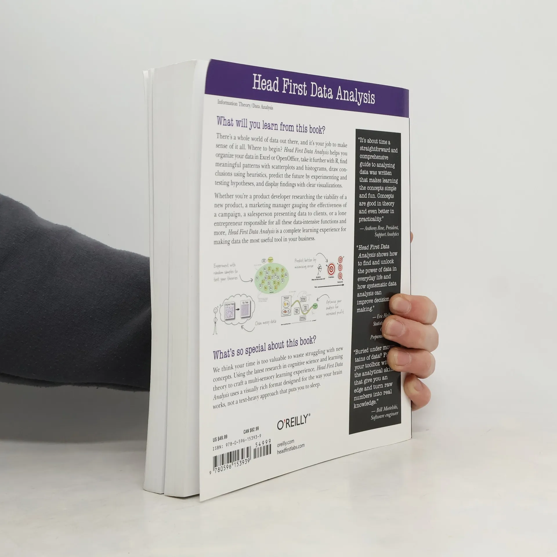 Today, interpreting data is a critical decision-making factor for businesses and organizations. If your job requires you to manage and analyze all kinds of data, turn to Head First Data Analysis , where you'll quickly learn how to collect and organize data, sort the distractions from the truth, find meaningful patterns, draw conclusions, predict the future, and present your findings to others.Whether you're a product developer researching the market viability of a new product or service, a marketing manager gauging or predicting the effectiveness of a campaign, a salesperson who needs data to support product presentations, or a lone entrepreneur responsible for all of these data-intensive functions and more, the unique approach in Head First Data Analysis is by far the most efficient way to learn what you need to know to convert raw data into a vital business tool.You'll learn how to: Using the latest research in cognitive science and learning theory to craft a multi-sensory learning experience, Head First Data Analysis uses a visually rich format designed for the way your brain works, not a text-heavy approach that puts you to sleep.