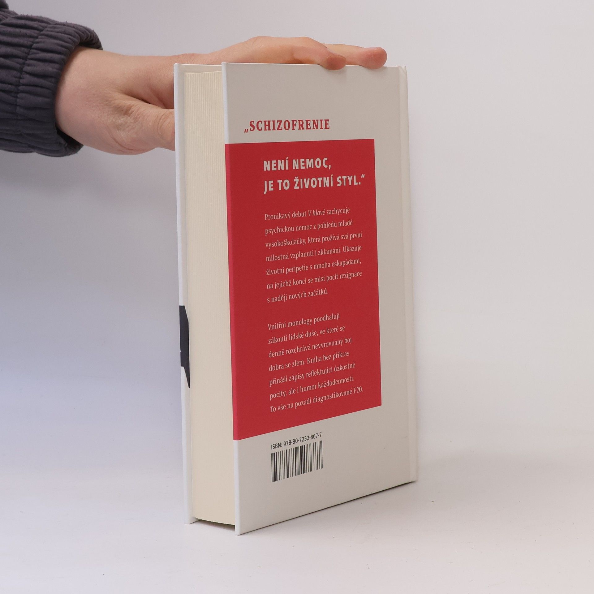 Ze zápisků mladé schizofreničky. Novela V hlavě zachycuje psychickou nemoc z pohledu mladé vysokoškolačky, která prožívá svá první milostná vzplanutí i zklamání. Ukazuje životní peripetie s mnoha eskapádami, na jejichž konci se mísí pocit rezignace s nadějí nových začátků. Vnitřní monology poodhalují zákoutí lidské duše, ve které se denně rozehrává nevyrovnaný boj dobra se zlem. Kniha bez příkras přináší zápisy reflektující úzkostné pocity, ale i humor každodennosti. To vše na pozadí diagnostikované F20.