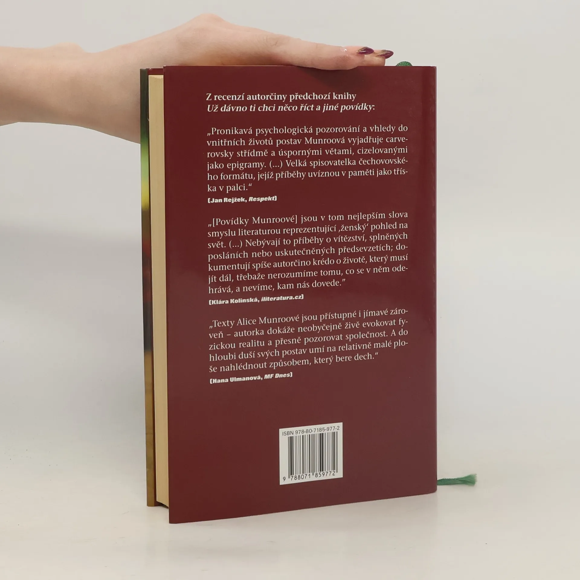 Světoznámá kanadská prozaička potvrzuje ve své druhé česky vydané knize pověst skvělé vypravěčky, především však neobyčejně vnímavé a citlivé pozorovatelky: příběhy jejích mladších i zralejších hrdinek, točící se kolem citových vztahů, rodinných trampot, mezigeneračních problémů či jen obyčejného stárnutí, dokáže vylíčit s takřka hmatatelnou živostí a schopností vcítit se do duše svých postav, aniž by sklouzla k laciné sentimentalitě nebo jen náznaku klišé.