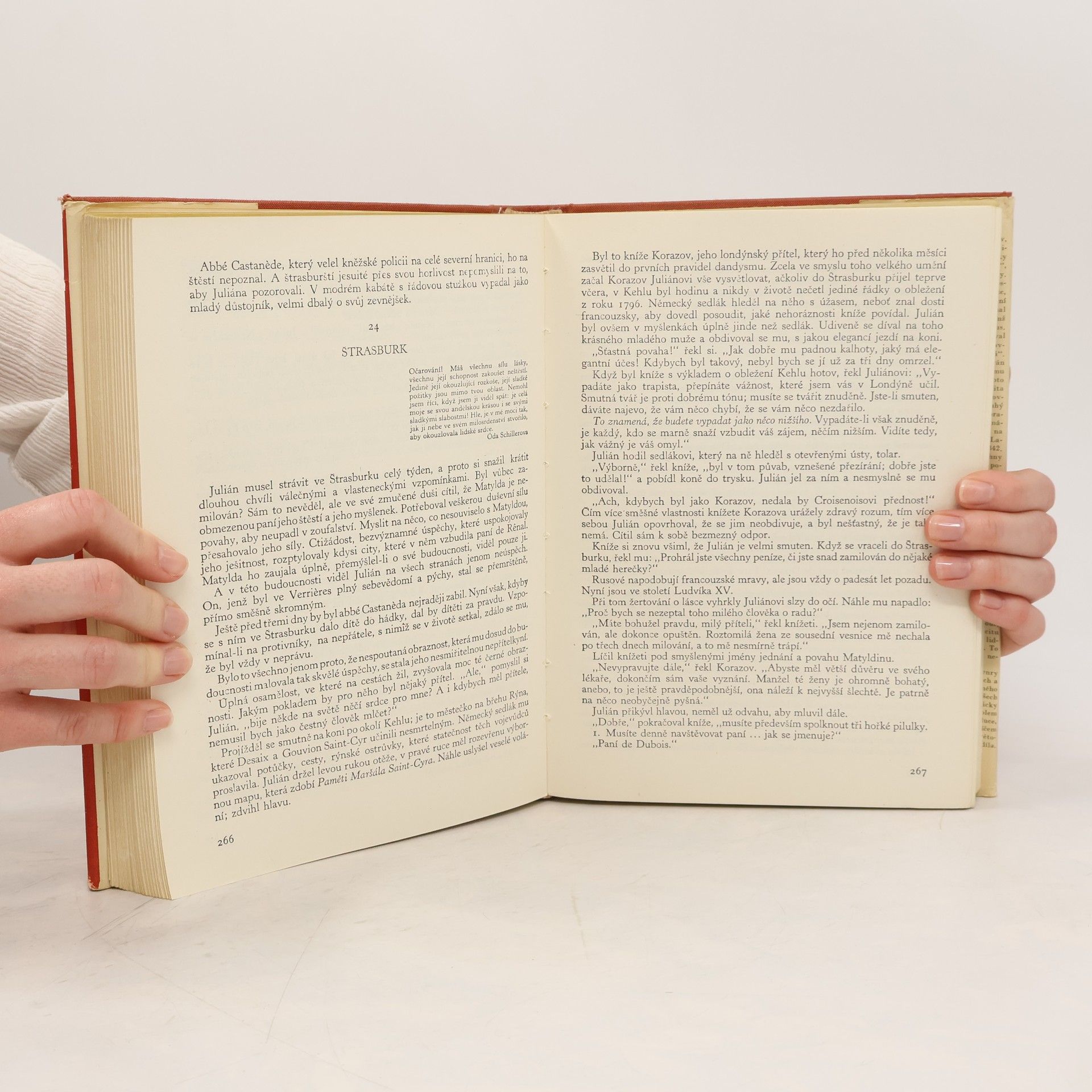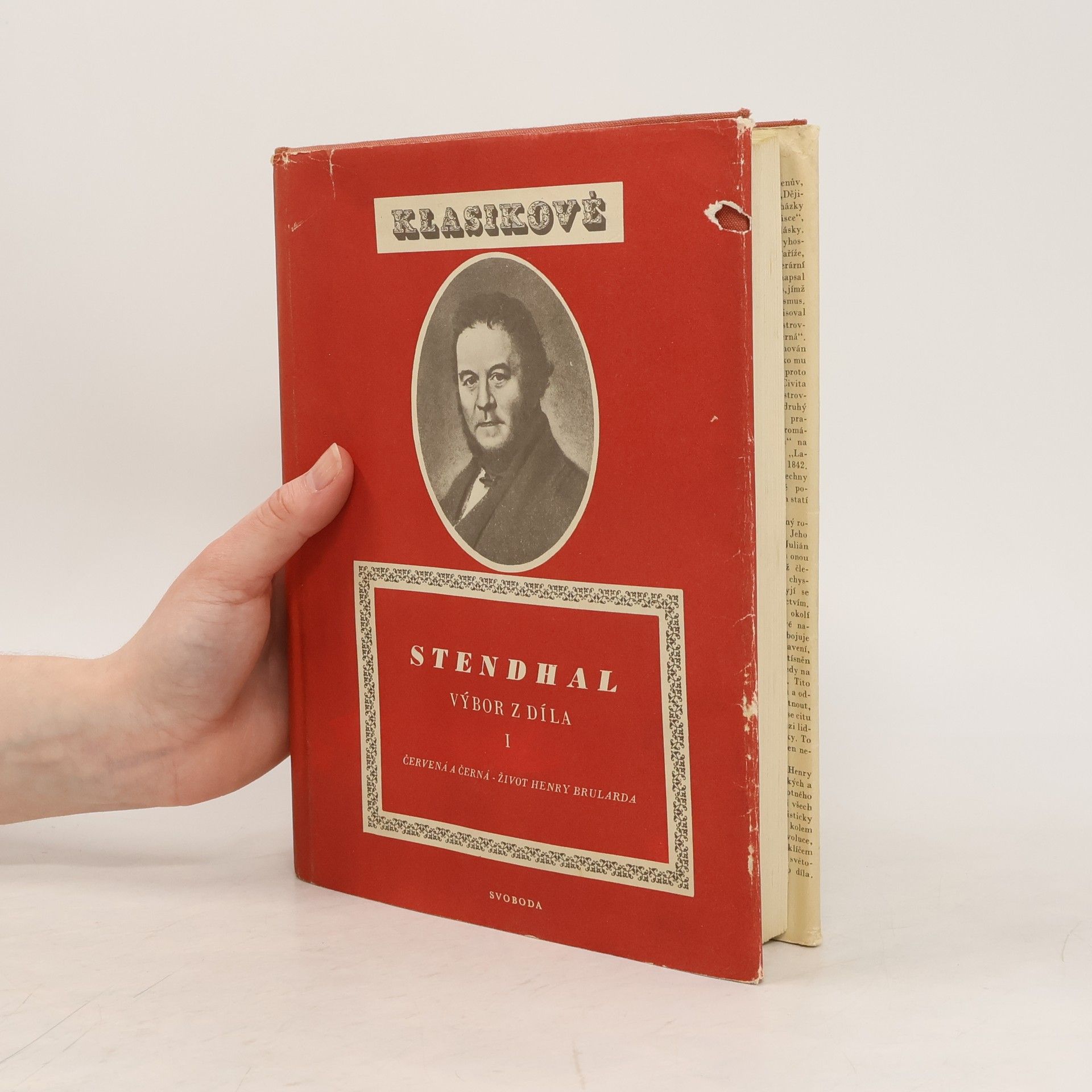 Obsáhlý výbor ze Stendhalova díla, které spolu s dílem Balzacovým je nejpřednějším projevem francouzského realismu za kapitalistické období, přináší v 1. svazku dvě práce; první z nich je v podstatných partiích založena na autobiografických prvcích, druhá pak je čistou autobiografií. Román "Červená a černá" (tj. barva napoleonské uniformy a barva kněžské sutany) je příběhem tesařského synka Juliána Sorela, který ve své potřebě vyšplhat se výše, ve své ctižádosti, přejímá od společnosti doby Restaurace metody cílevědomé přetvářky - ovšem marně; jeho rozlet, podporovaný láskou dvou žen, končí pod guillotinou. "Život Henry Brularda" je S. svéživotopis doby mladosti, psaný až r. 1835-36. Autor, usilující o absolutní upřímnost, nijak nepřikrašluje temné stránky svého charakteru ani své vnitřní rozpory a ve své přesnosti (ačkoliv to píše po nějakých 35-40 letech, ve své padesátce) doplňuje text vlastními kresbami a náčrty.