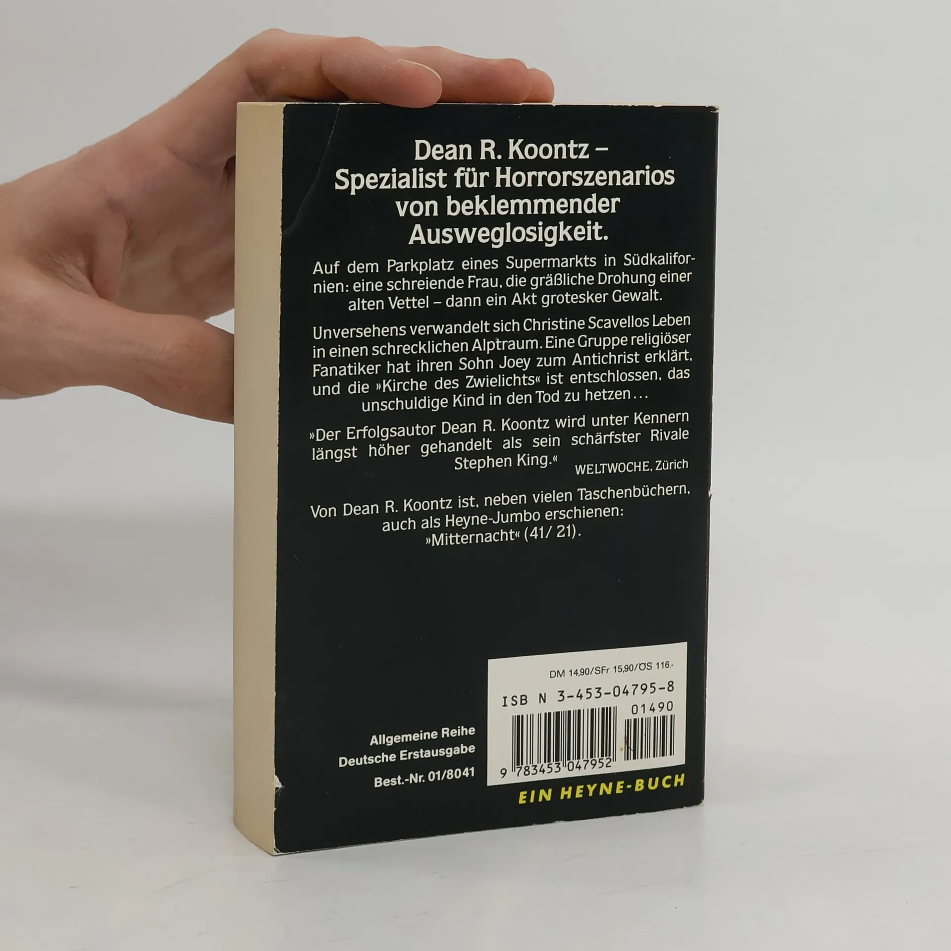 Auf dem Parkplatz eines Supermarkts in Südkalifornien. eine schreiende Frau, die grässliche Drohung einer alten Vettel - dann ein Akt grotesker Gewalt. Unversehens verwandelt sich Christine Scavellos Leben in einen schrecklichen Alptraum. Eine Gruppe religiöser Fanatiker hat ihren Sohn Joey zum Antichrist erklärt, und die »Kirche des Zwielichts« ist entschlossen, das unschuldige Kind in den Tod zu hetzen ...