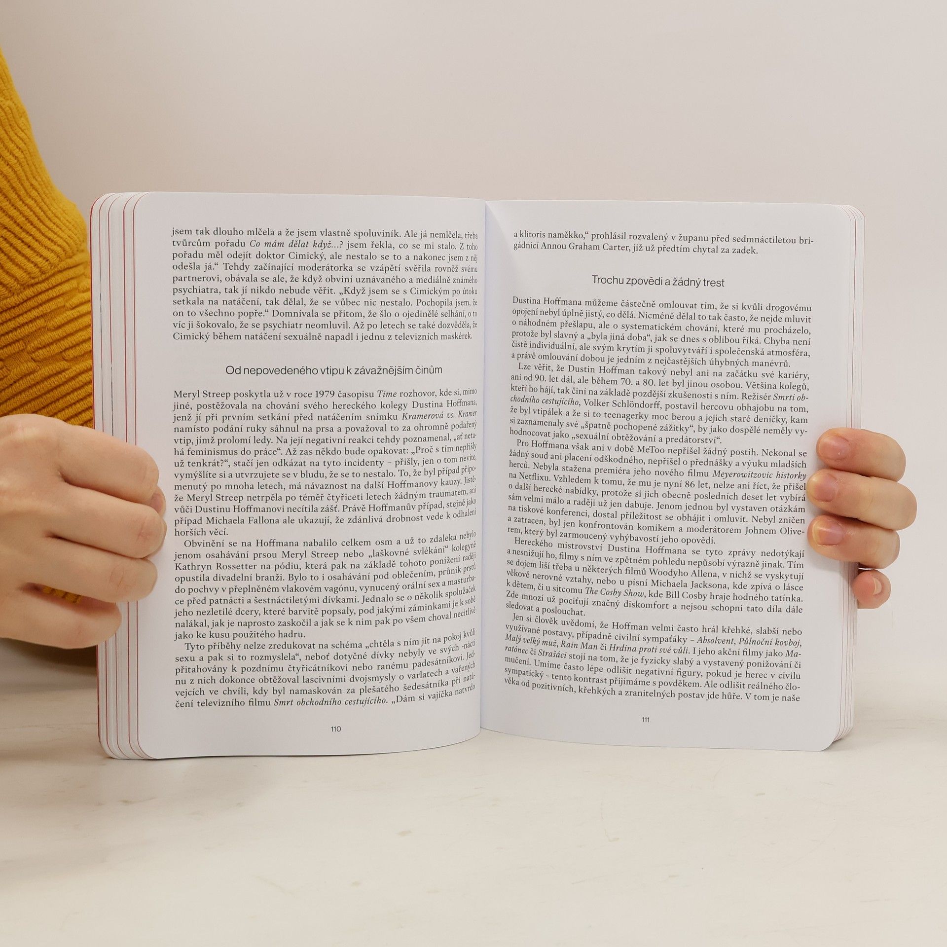 1. část Velmi Pozdního Odpoledne má příběhově-reportážní charakter; Pojednává o tom, jak u nás selhala média v informování o MeToo. Obsažené kauzy: “Shrnutí dosud známých informací o kauzách, kde došlo k odsouzení (např. Harvey Weinstein a Bill Cosby), i kauzách, které zůstaly otevřené (Marilyn Manson či Gérard Depardieu). Kniha se věnuje také případům, jež dopadly ve prospěch podezřelých (Kevin Spacey nebo Johnny Depp). Nechybí pokrytí českých kauz Dominika Feriho a Jana Cimického. Investigativní část přináší navíc několik svědectví, jež dosud nevyšla na povrch. Celkově se jedná o desítky složitých případů, kdy pravda často nebývá jednoduchá a knize jde o maximální komplexnost.