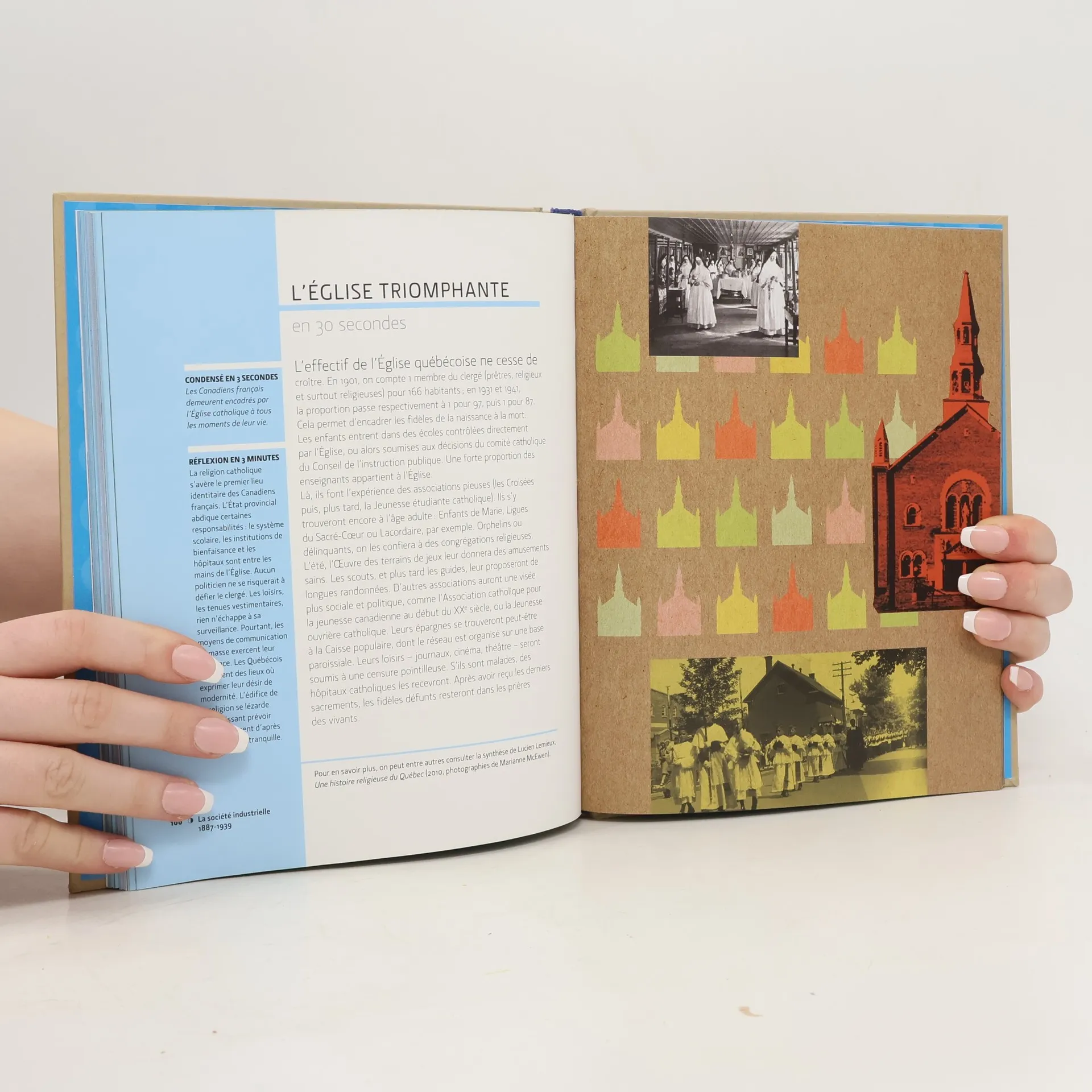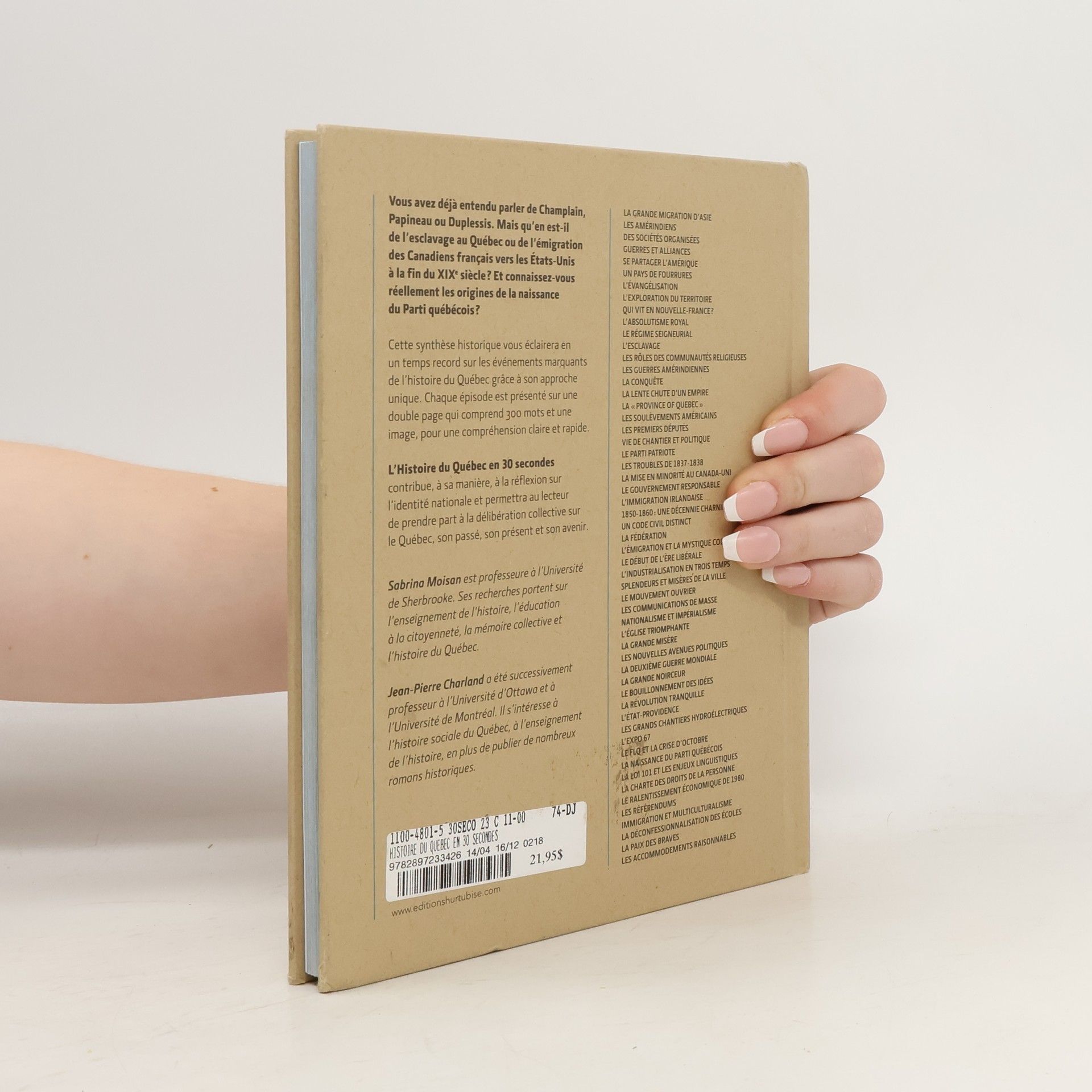 "Vous avez déjà entendu parler de Champlain, Papineau ou Duplessis. Mais qu'en est-il de l'esclavage au Québec ou de l'émigration des Canadiens français vers les États-Unis à la fin du XIXe siècle? Et connaissez-vous réellement les origines de la naissance du Parti québécois? Cette synthèse historique vous éclairera en un temps record sur les événements marquants de l'histoire du Québec grâce à son approche unique. Chaque épisode est présenté sur une double page qui comprend 300 mots et une image, pour une compréhension claire et rapide. L'Histoire du Québec en 30 secondes contribue, à sa manière, à la réflexion sur l'identité nationale et permettra au lecteur de prendre part à la délibération collective sur le Québec, son passé, son présent et son avenir."--