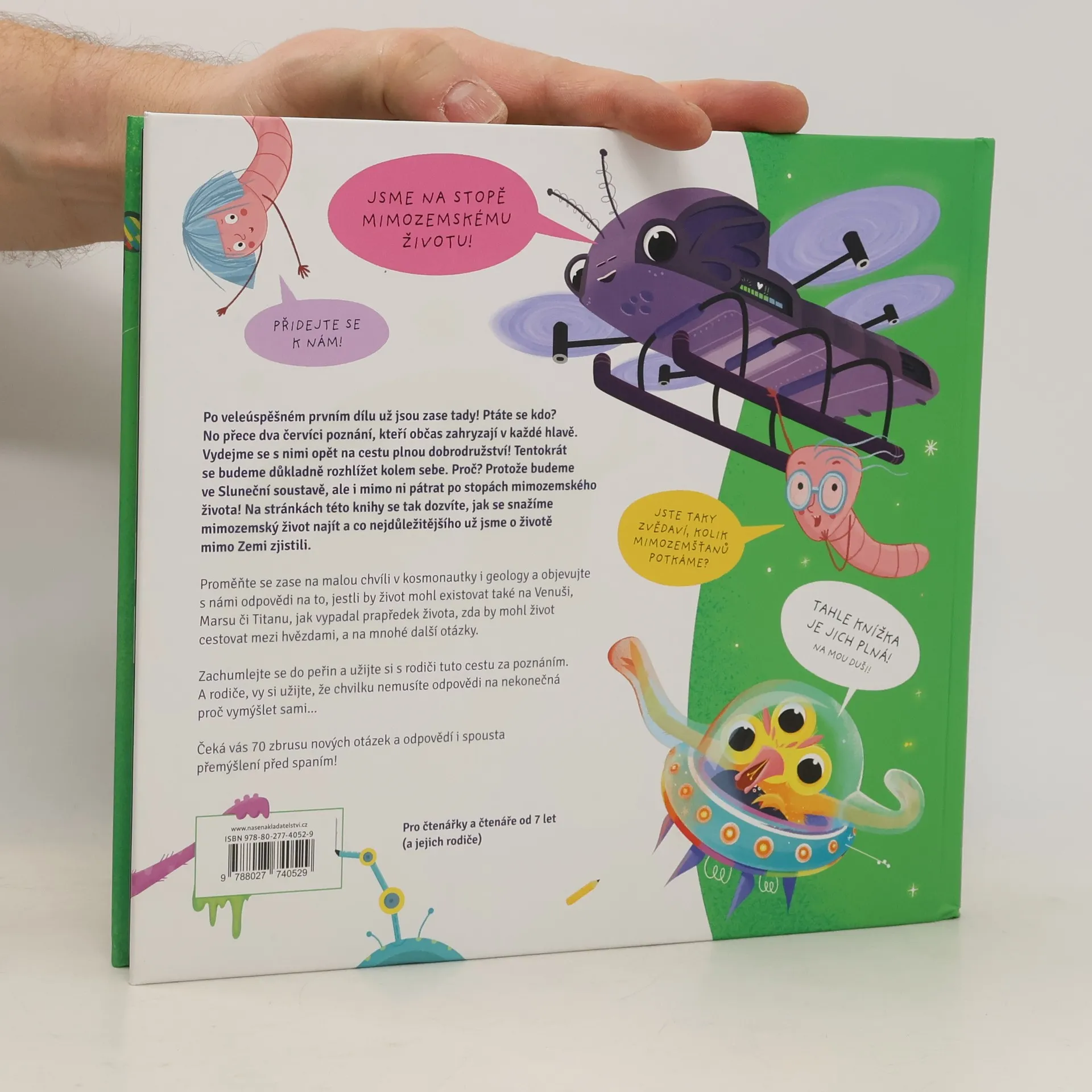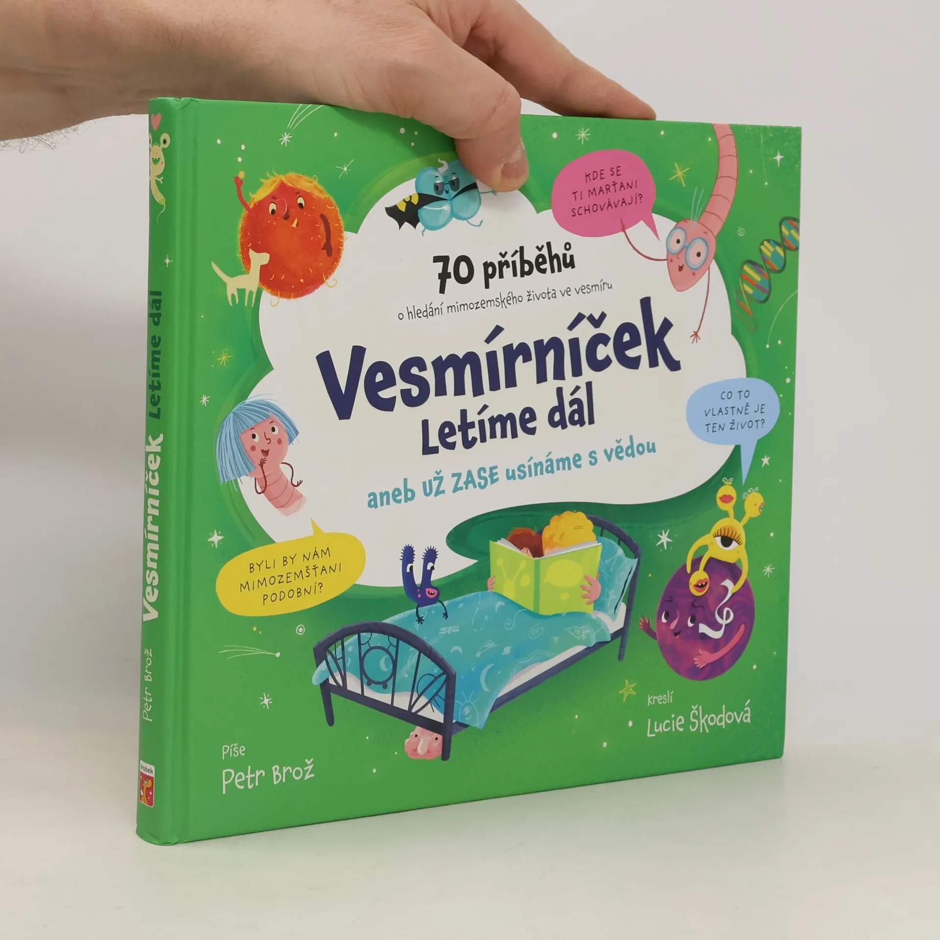 Už jsou zase tady! Ptáte se kdo? No přece dva červíci poznání, kteří občas zahryzají v každé hlavě. Vydejme se s nimi opět na cestu plnou dobrodružství! Tentokrát se budeme důkladně rozhlížet kolem sebe. Proč? Protože budeme ve Sluneční soustavě, ale i mimo ni, pátrat po stopách mimozemského života! Na stránkách této knihy se takdozvíte, jak se snažíme mimozemský život najít a co nejdůležitějšího už jsme o životě mimo Zemi zjistili. Proměňte se zase na malou chvíli v kosmonautky i geology a objevujte s námi odpovědi na to, jestli by život mohl existovat také na Venuši, Marsu či Titanu, jak vypadal prapředek života, zda by mohl život cestovat mezi hvězdami, a na mnohé další otázky. Zachumlejte se pod peřinu a užijte si s rodiči tuto cestu za poznáním. A rodiče, vy si užijte, že chvilku nemusíte odpovědi na nekonečná proč vymýšlet sami... Čeká vás 70 zbrusu nových otázek a odpovědí i spousta přemýšlení před spaním!