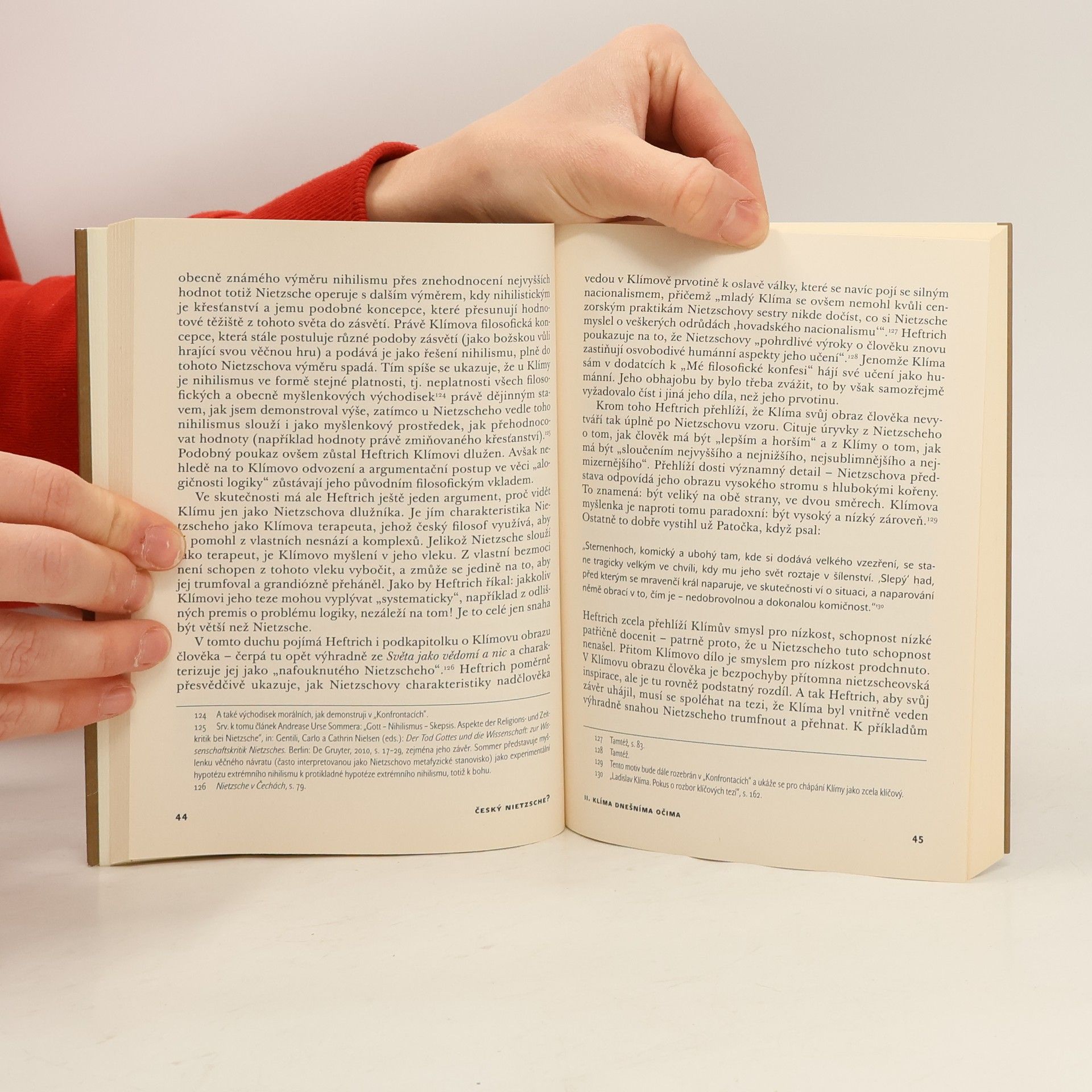 Knižní studie se zaměřuje na vztah myšlení Friedricha Nietzscheho a Ladislava Klímy. Kriticky se staví k charakteristice Klímy jako „českého Nietzscheho“, a to jednak v konfrontaci s dřívějšími výklady zkoumaného vztahu, zejména s pojetím slavisty Urse Heftricha, jednak srovnáním textů, v nichž oba filozofové vykazují největší podobnosti (Nietzschovy knihy Antikrist, Genealogie morálky a Ecce homo s pasážemi Klímova Velkého romanu a autobiografickými texty). Klíma v tomto srovnání vystupuje jako nezávislý myslitel, především s ohledem na jeho smysl pro nízké, nauku o kontradikcionismu a (neo)kynismu. Nejpodstatnější doklad Klímovy svébytnosti však spočívá v hledání smyslu jeho myšlení pro dnešek, jež není odvoditelné z Nietzscheho. Zde autor argumentuje mimo jiné Klímovým neotřelým filozofickým stylem.