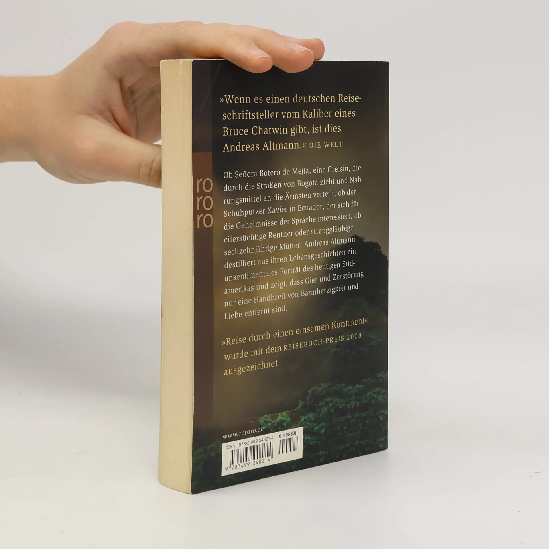„Wenn es einen deutschen Reiseschriftsteller vom Kaliber eines Bruce Chatwin gibt, ist dies Andreas Altmann“ (Die Welt) Ob Señora Botero de Mejía, eine Greisin, die durch die Straßen von Bogota zieht und Nahrungsmittel an die Ärmsten verteilt, ob der Schuhputer Xavier in Ecuador, der sich für die Geheimnisse der Sprache interessiert, ob eifersüchtige Rentner oder strenggläubige 16-jährige Mütter: Andreas Altmann destilliert aus ihren Lebensgeschichten ein unsentimentales Porträt des heutigen Südamerika und zeigt, dass Gier und Zerstörung nur eine Handbreit von Barmherzigkeit und Liebe entfernt sind. „Reise durch einen einsamen Kontinent“ wurde mit dem REISEBUCH-PREIS 2008ausgezeichnet.