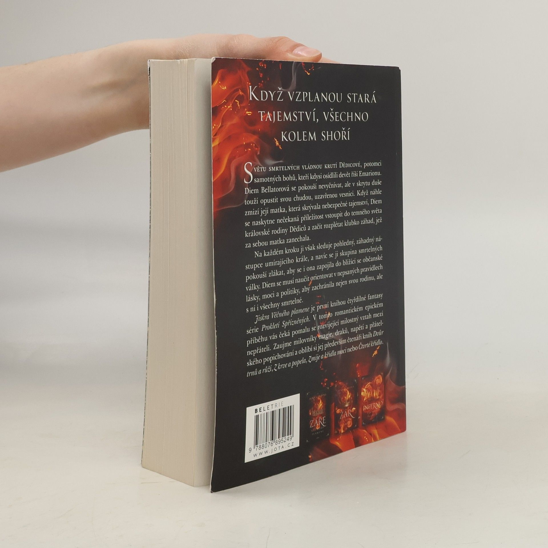 Když vzplanou stará tajemství, všechno kolem shoří. Světu smrtelných vládnou krutí Dědicové, potomci samotných bohů, kteří kdysi osídlili devět říší Emarionu. Diem Bellatorová se pokouší nevyčnívat, ale v skrytu duše touží opustit svou chudou, uzavřenou vesnici. Když náhle zmizí její matka, která skrývala nebezpečné tajemství, Diem se naskytne nečekaná příležitost vstoupit do temného světa královské rodiny Dědiců a začít rozplétat klubko záhad, jež za sebou matka zanechala. Na každém kroku ji sleduje pohledný, záhadný nástupce umírajícího krále. K tomu je tu skupina smrtelných, která se ji pokouší zlákat, aby se i ona zapojila do blížící se občanské války. Diem se musí naučit orientovat v nepsaných pravidlech lásky, moci a politiky, aby zachránila nejen svou rodinu, ale s ní i všechny smrtelné. Jiskra Věčného plamene je první knihou čtyřdílné fantasy série Prokletí Spřízněných. V tomto romantickém epickém příběhu vás čeká pomalu se rozvíjející vztah mezi nepřáteli. Zaujme milovníky magie, draků, napětí a přátelského popichování a oblíbí si jej především čtenáři knih Dvůr trnů a růží, Z krve a popela, Zmije a křídla noci nebo Čtvrté křídlo.