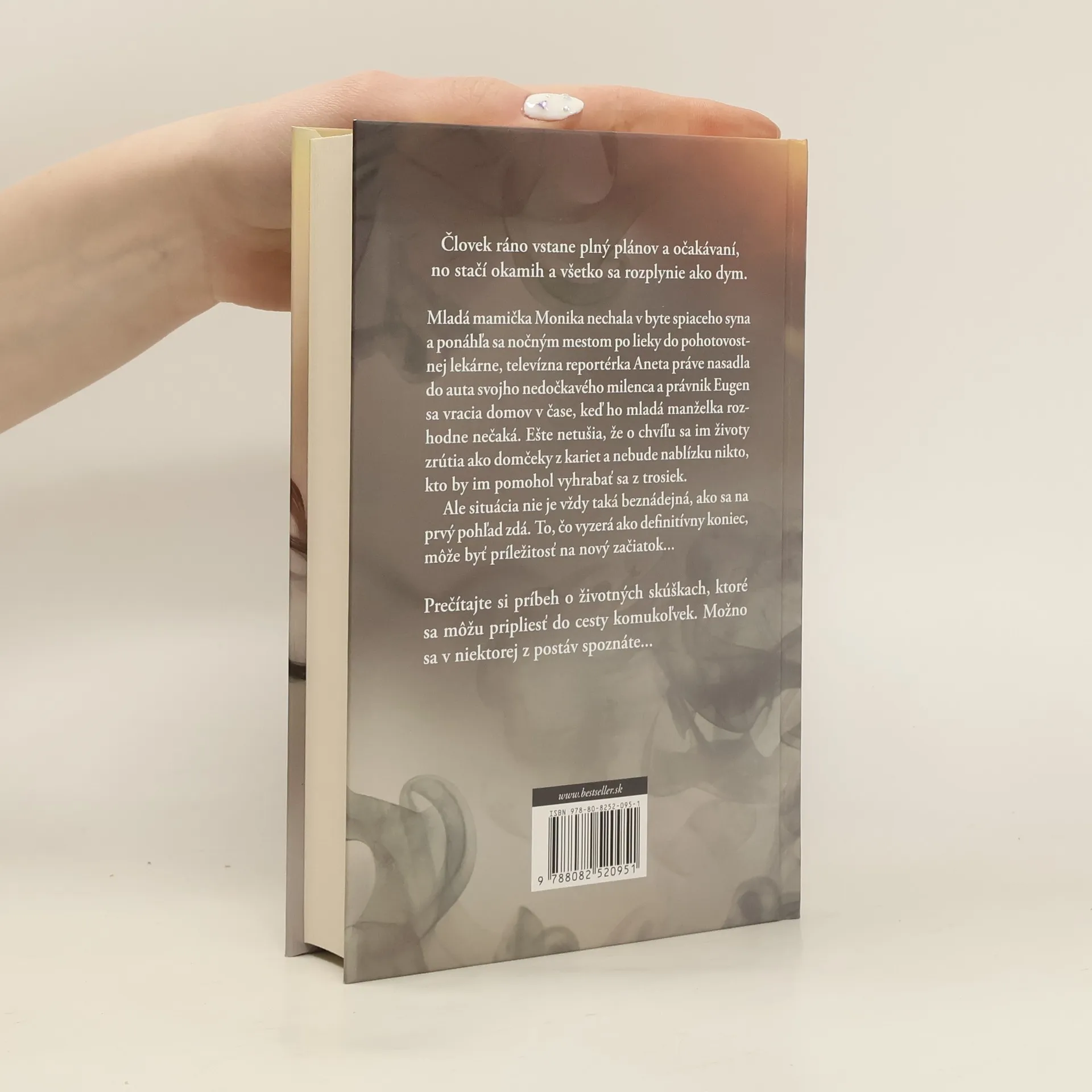 Človek ráno vstane plný plánov a očakávaní, no niekedy stačí okamih a všetko sa rozplynie ako dym. Mladá mamička Monika nechala v byte spiaceho syna a ponáhľa sa nočným mestom po lieky do pohotovostnej lekárne, televízna reportérka Aneta práve nasadla do auta svojho nedočkavého milenca a právnik Eugen sa vracia domov v čase, keď ho mladá manželka rozhodne nečaká. Ešte netušia, že o chvíľu sa im životy zrútia ako domčeky z kariet a nebude nablízku nikto, kto by im pomohol vyhrabať sa z trosiek. Ale situácia nie je vždy taká beznádejná, ako sa na prvý pohľad zdá. To, čo vyzerá ako definitívny koniec, môže byť príležitosť na nový začiatok... Prečítajte si príbeh o životných skúškach, ktoré sa môžu pripliesť do cesty komukoľvek. Možno sa v niektorej z postáv spoznáte...