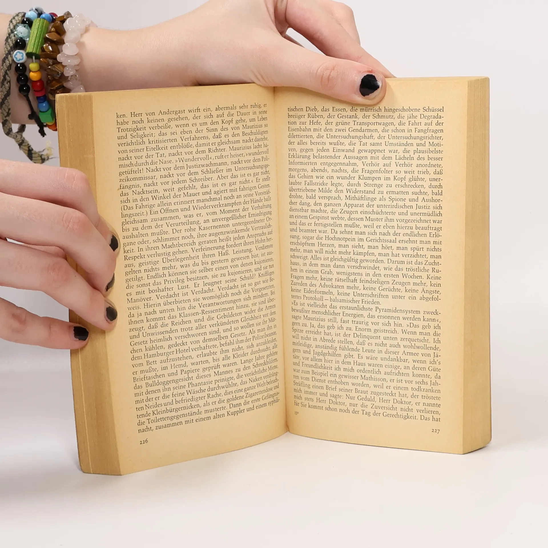 „[.] Laß ab von der Vorstellung, dass Gerechtigkeit und Justiz ein und dasselbe sind oder zu sein haben. Sie können es nicht sein. Es liegt außerhalb menschlicher und irdischer Möglichkeit. Sie verhalten sich zueinander wie die Symbole des Glaubens zur religiösen Übung. Du kannst mit dem Symbol nicht leben. Doch in der strengen und gewissenhaften Übung das ewige Symbol über sich zu wissen, das. wie soll ich sagen, das absolviert. [.]“ – Etzel blickt eine Weile mit zusammengepreßten Lippen vor sich nieder; auf einmal schreit er schrill: „Nein!“ Die Augen funkeln böse. „Nein!“ schreit er abermals. „Damit kann ich und damit will ich nicht leben.“ Sein ganzer Intellekt fängt Feuer. Die Respektschranke bricht zusammen. „Das erkenn ich nicht an“, stammelt er in einer Erbitterung, die sich wie Betrunkenheit äußert, „Symbol. Übung. Was denn. Faule Ausreden.“