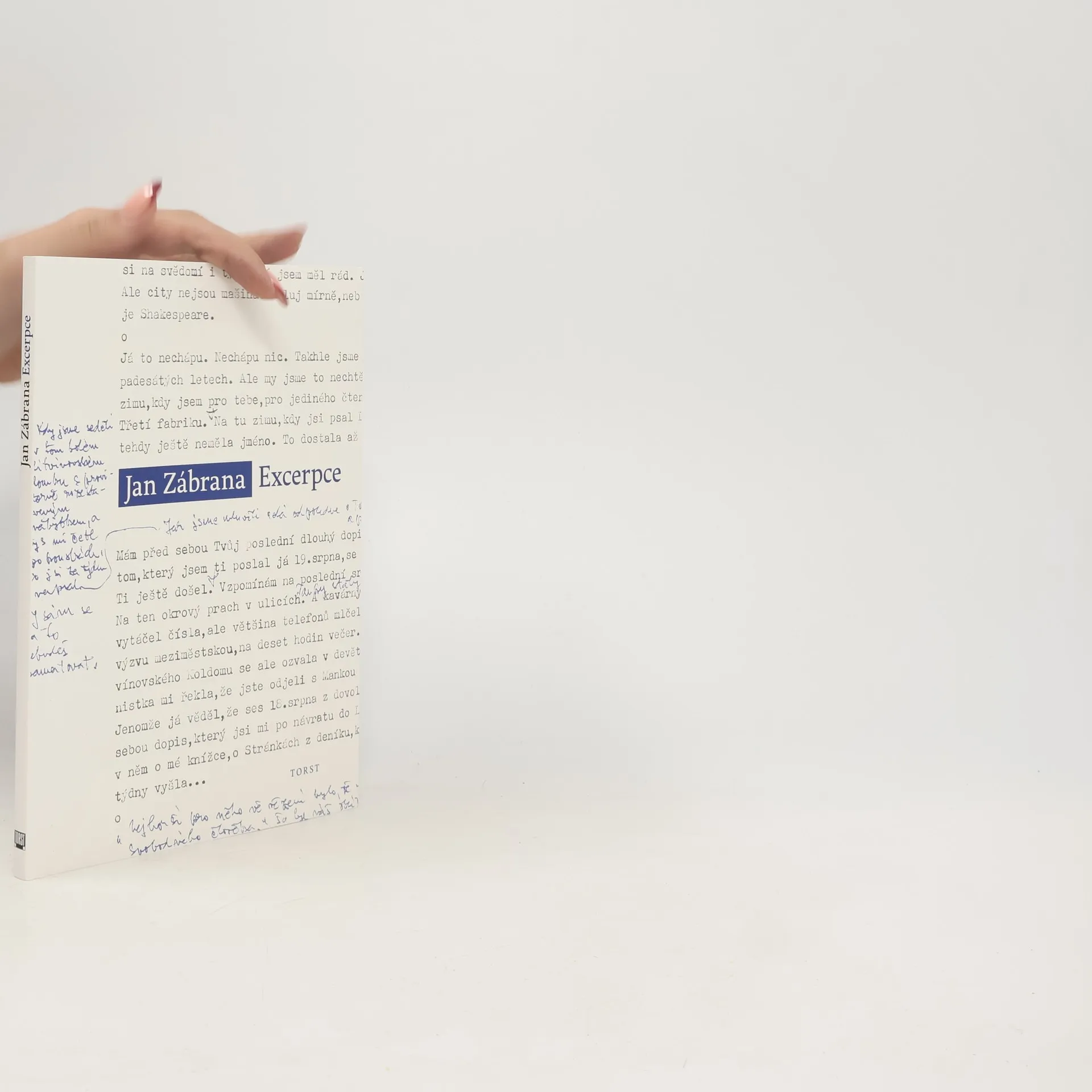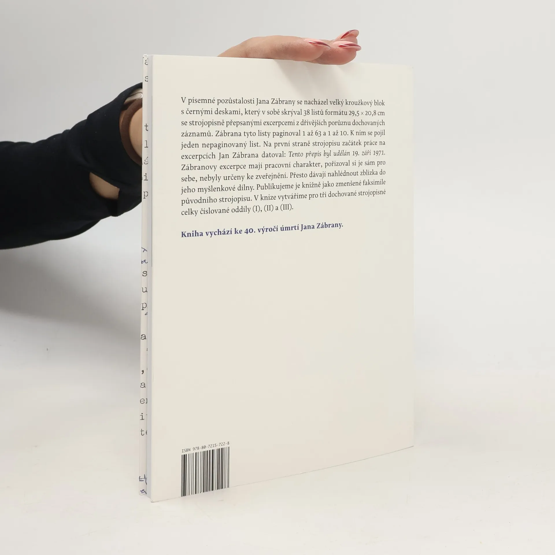 Ke 40. výročí úmrtí Jana Zábrany vydává nakladatelství Torst faksimile strojopisu jeho excerpcí z vlastních předchozích záznamů. Mezi desítkami desek, sešitů, zápisníků a rukopisných konvolutů básní, próz, deníků a esejů měl v písemné pozůstalosti Jana Zábrany zcela zvláštní místo paginovaný čistopis strojopisu z počátkusedmdesátých let, který si vevázal do kroužkového pořadače na listech papíru formátu A4. Zábrana do tohoto strojopisu excerpoval své poznámky k básním, prózám a zamýšleným deníkům, jež si po léta zapisoval do mnoha sešitů, na volné papíry, do zápisníků a diářů. Byl to jeho pokus udělat si na počátku normalizace pořádek ve svých záznamech i sám v sobě. Nejde o hotové dílo, ale o tvůrčí materiál vhodný k dalšímu možnému zpracovávání, k promýšlení a využití. Zajímavý je svou uceleností. Jde o dva celky excerpcí, z nich jeden má 63 stran a druhý 10 stran. K nim se v pořadači volně váže ještě jedna strana, jde tedy o celkem 74 stran strojopisu, jež zde jsou předloženy čtenářům jako faksimile – jakékoli jiné vydání by celkový vjem z tohoto Zábranova strojopisu výrazně ochudilo. Kniha představuje unikátní vhled do tvůrčí dílny básníka, prozaika, esejisty, překladatele a editora. Vychází doplněna ediční poznámkou Jana Šulce.
