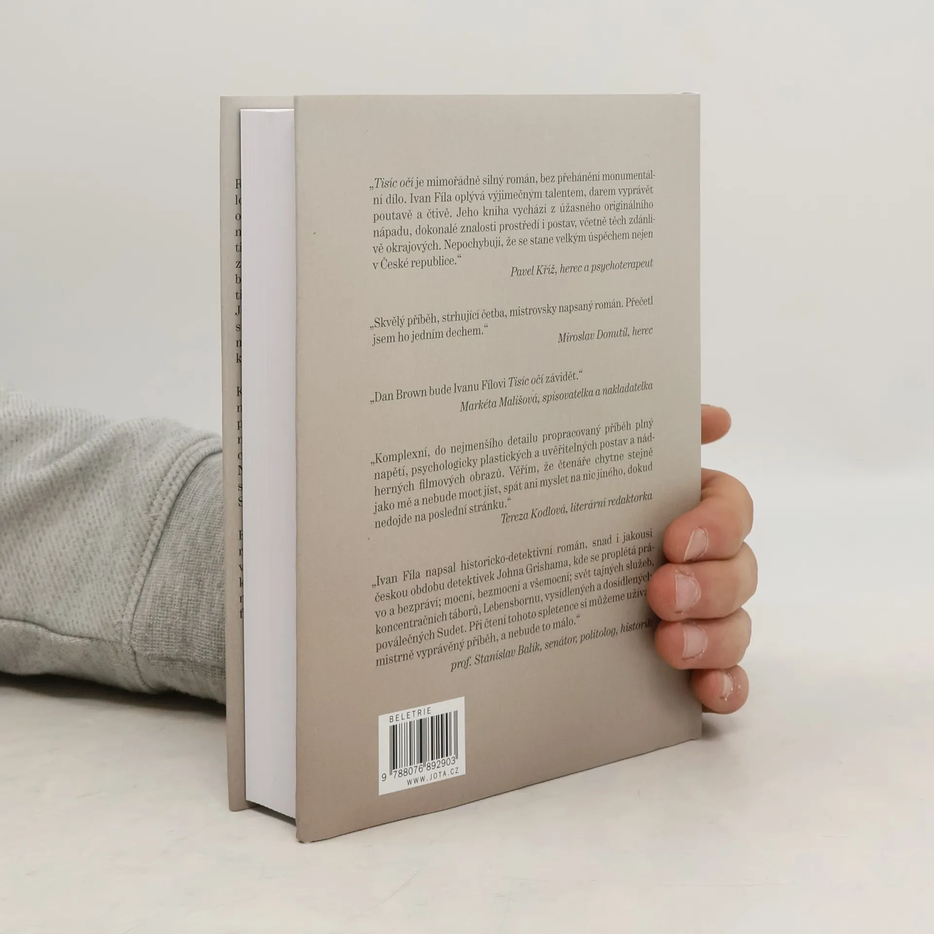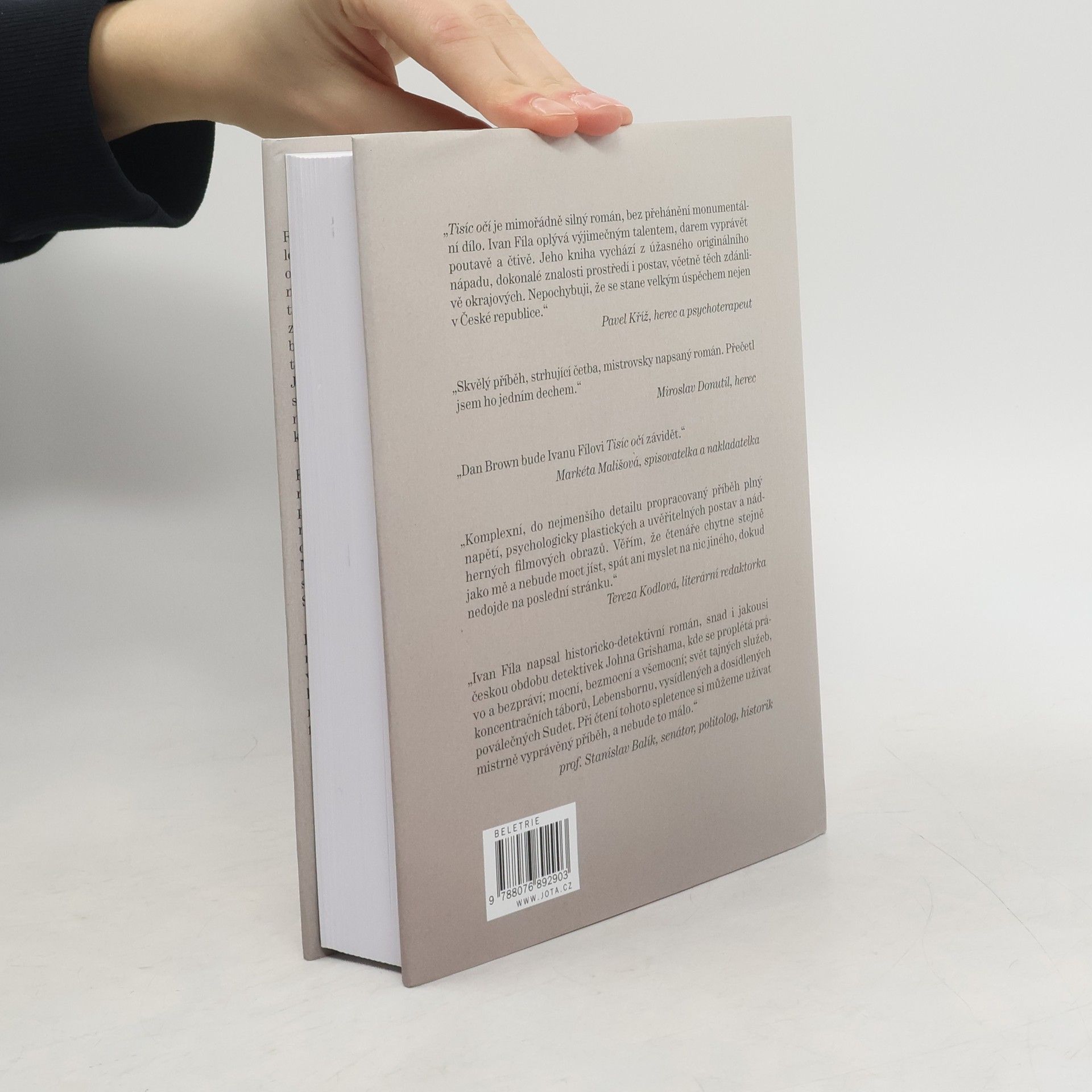 Román Ivana Fíly Tisíc očí, inspirovaný skutečnými událostmi, je příběh téměř detektivní, napínavá rodinná sága z období od druhé světové války až po dnešek. Hlavní hrdinka, oběť zrůdného nacistického programu Lebensborn, hledá čtyřicet let svou biologickou matku a také sebe sama. S pomocí bývalého soudce se dostane na stopu válečného zločince, pozdějšího agenta STB, který si pod falešnou identitou užívá zdánlivě spokojené stáří v Jeseníkách. Neobvykle čilý a vitální muž zprvu netuší, proč za ním žena přišla, a co od něj chce. Až když ho osloví přezdívkou, na kterou slyšel v koncentračním táboře Mauthausen, kde rozhodoval o životě a smrti tisíce týraných obětí, pochopí, že minulost dohnala i jeho. Jak ale potrestat osmadevadesátiletého muže, který už nežije pro radost, ale za trest? A také jak potvrdit nebo vyvrátit teorii, že v každém z nás je potenciální vrah? Fílovo existenciální drama s prvky mystického thrilleru z temného moravskoslezského severu, Berlína a Porúří se svým originálním vypravěčským stylem vymyká jakékoli jednoznačnosti a žánrovému klišé.